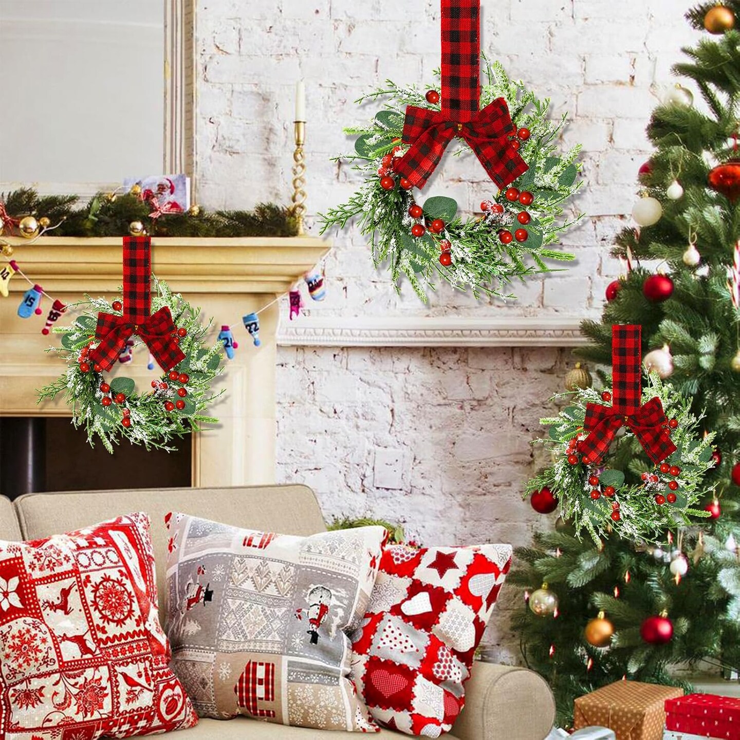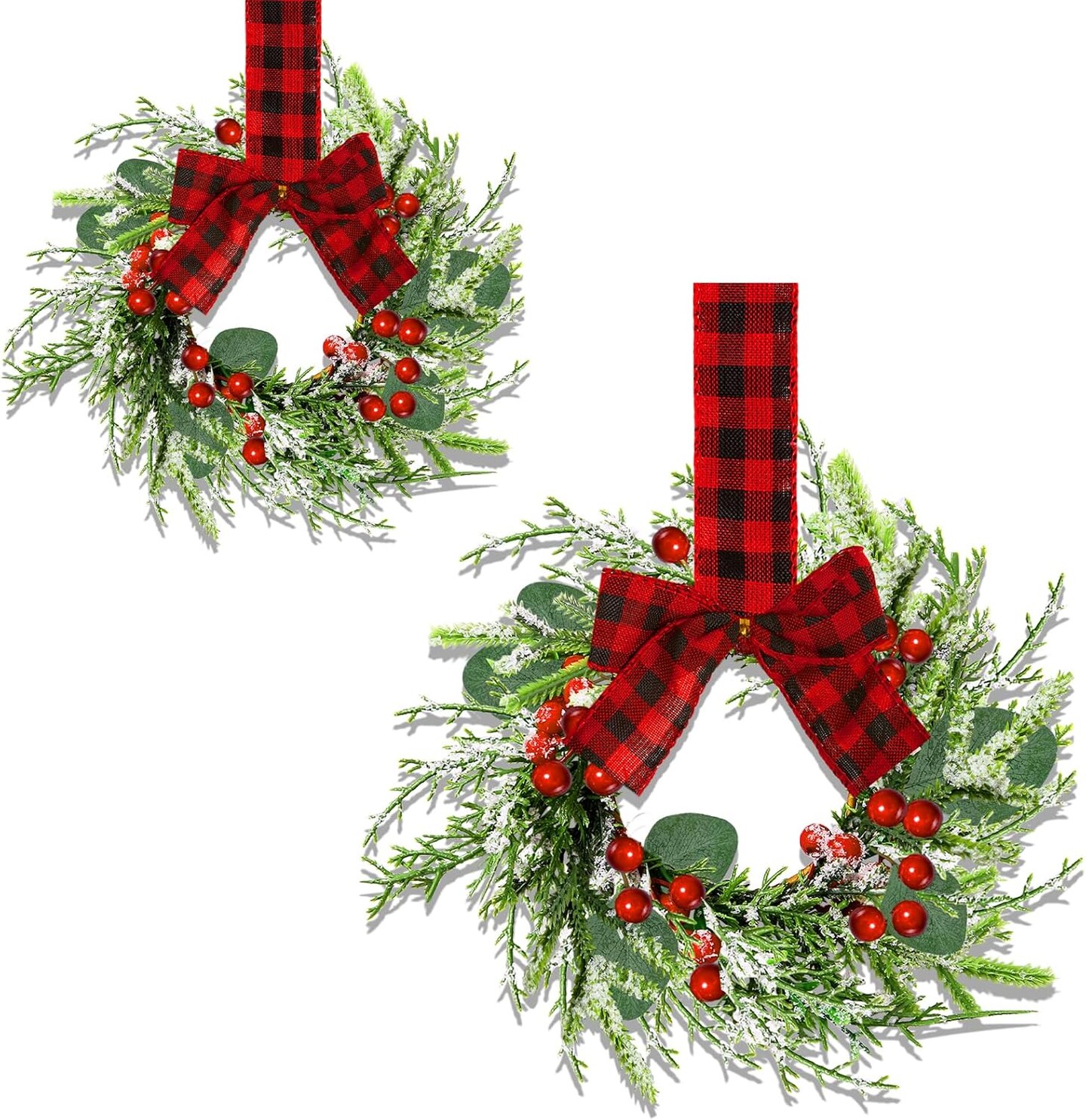 Mini Cabinet Christmas Wreath - 2Pcs 9IN Artificial Red Berries Plaid Small Christmas Wreath for Kitchen Cabinets, Window Porch Wall Indoor Home Hanging Decorating