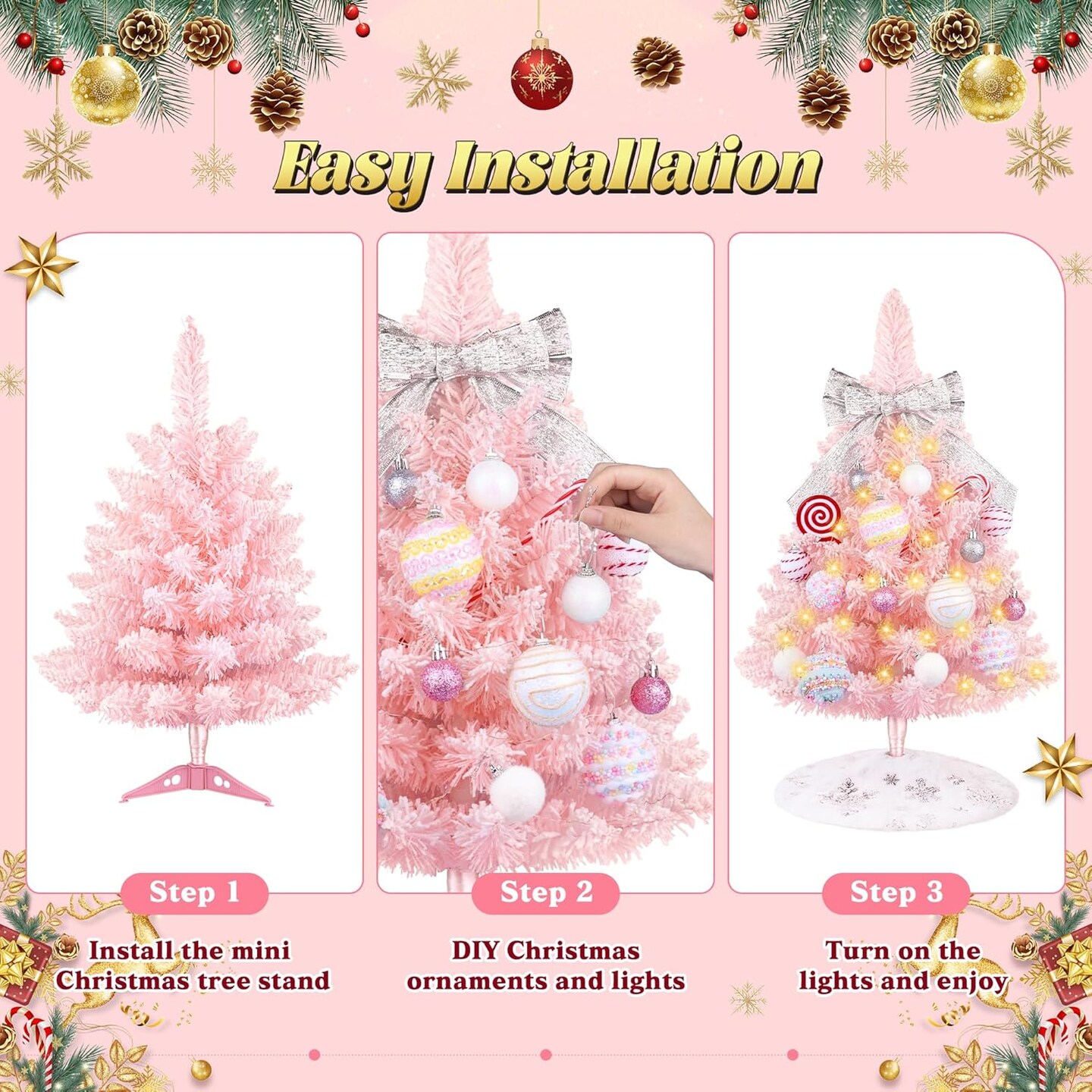 Mini Pink Christmas Tree with Lights Table Top (Pink1) 16.5"D x 5.5"W x 4.3"H