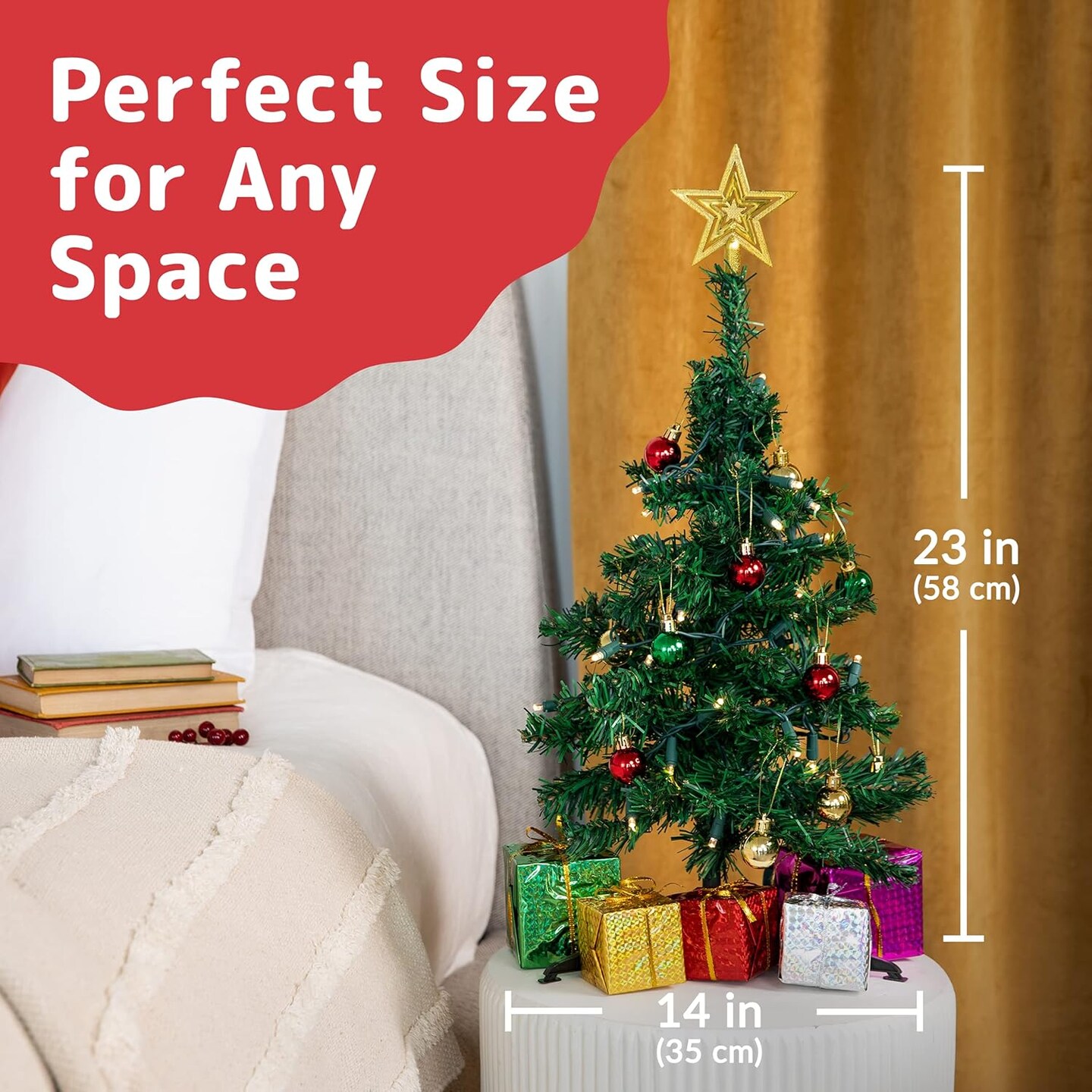 Mini Tabletop Christmas Tree Set with LED Lights, Star, Ornaments, and Gift Boxes - 23-Inch (Green)