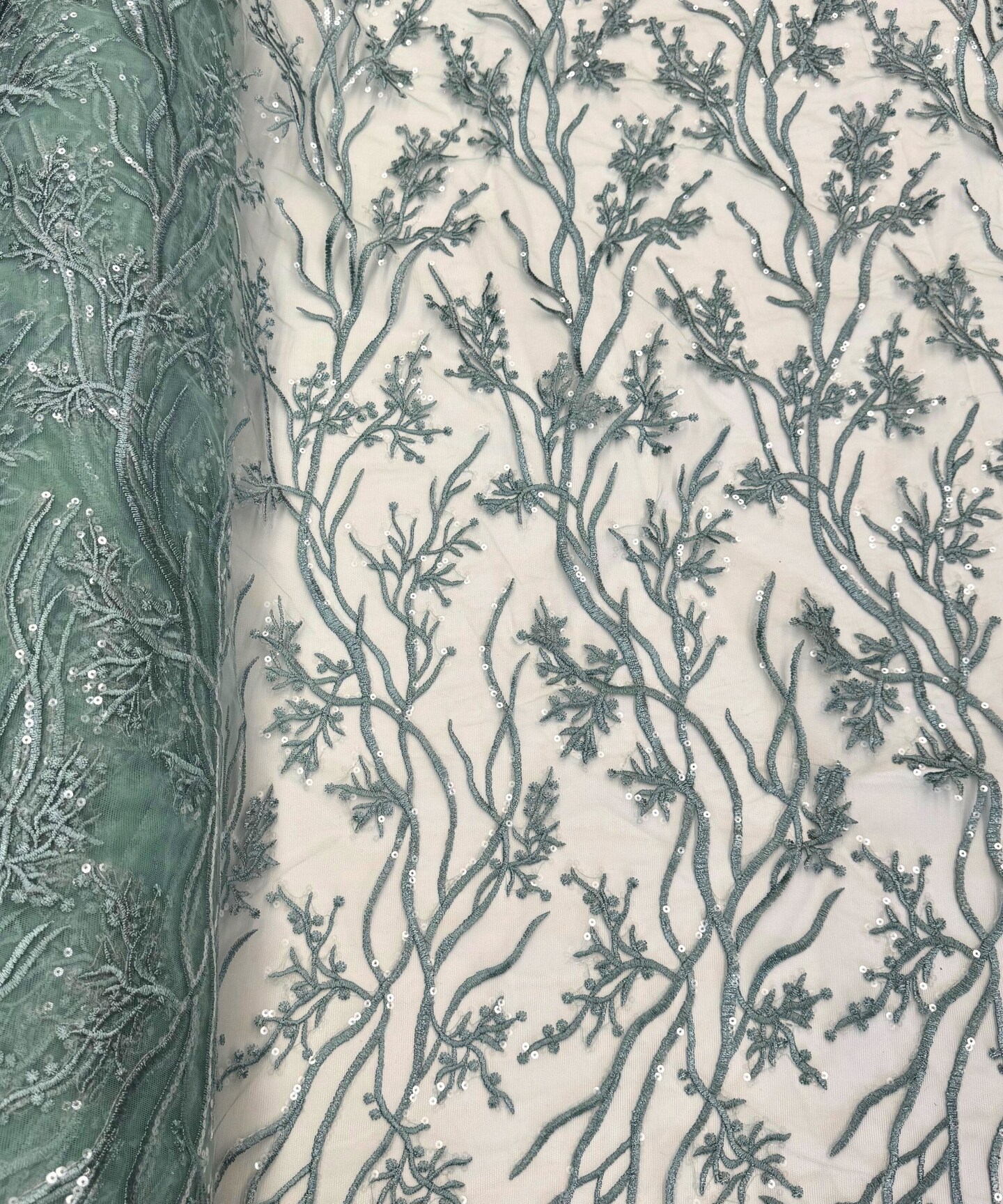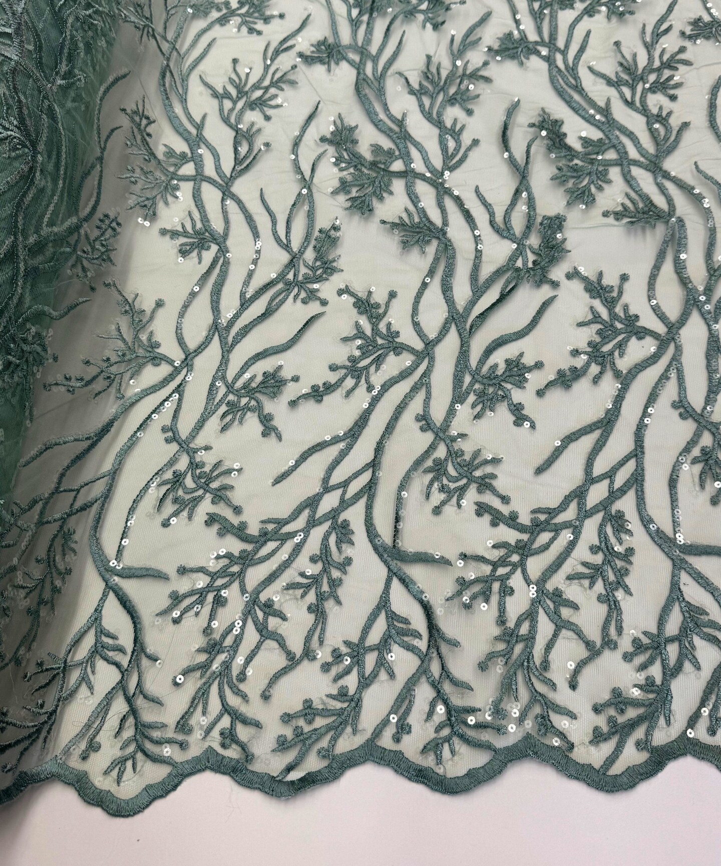 Mint Sequin Embroidered Lace Fabric by the Yard, 54" Wide Floral Mesh Lace with Double Scalloped Edges