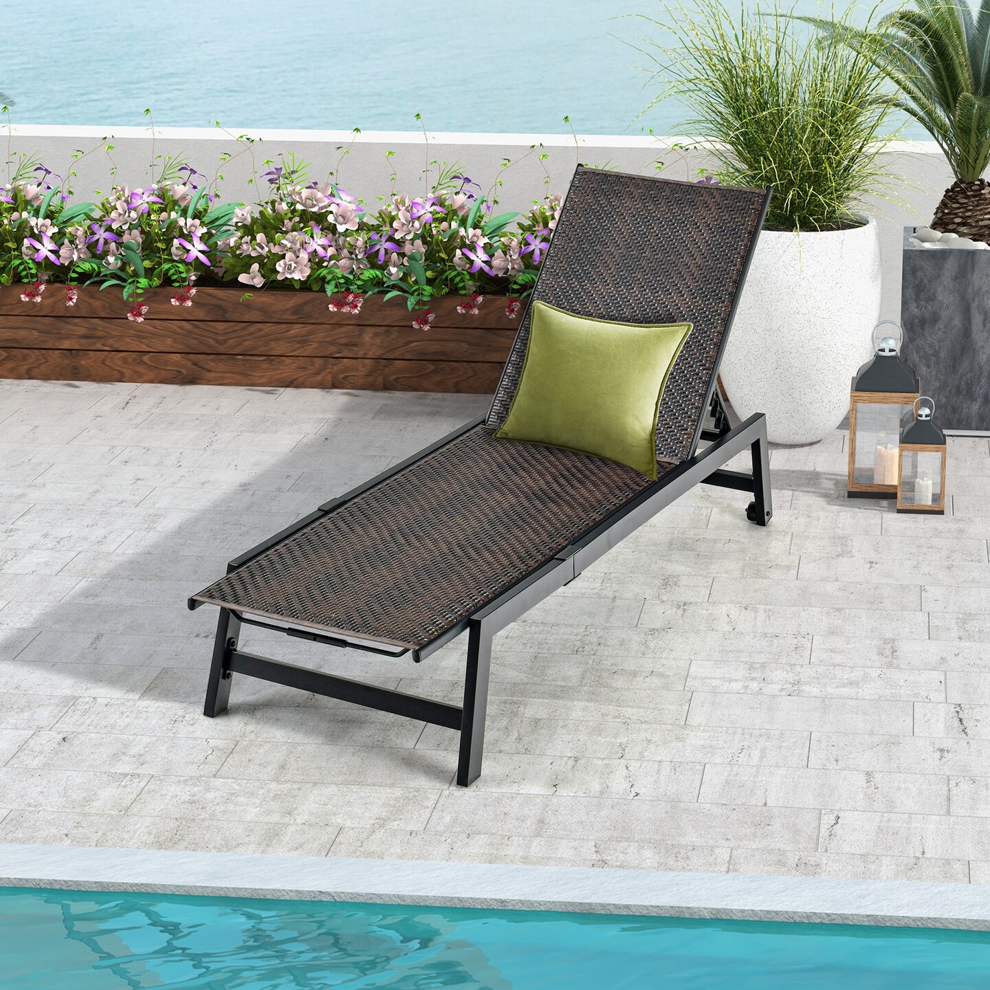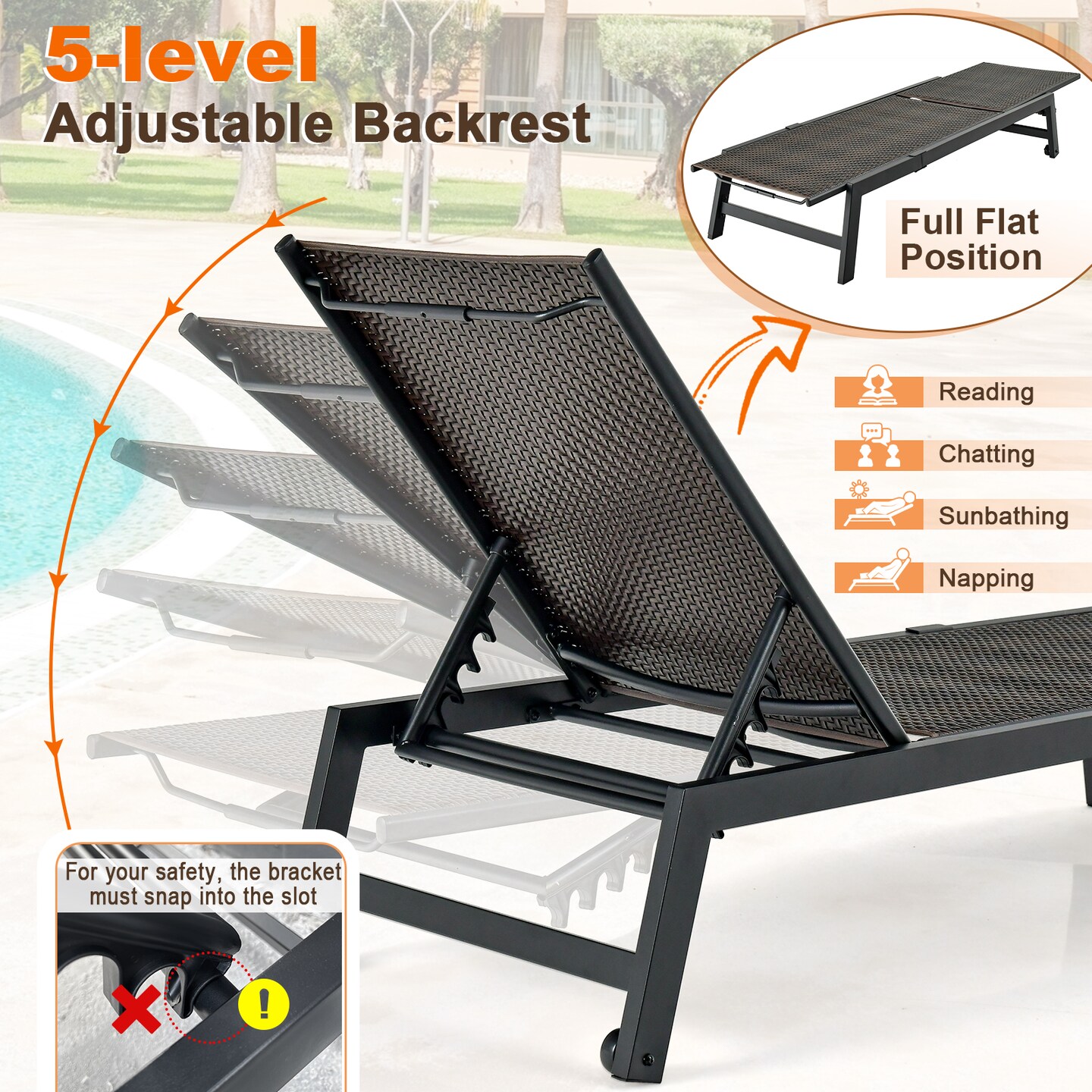 Mix Brown PE Rattan Chaise Lounge 5-Position Adjustable Outdoor Recliner 400lbs