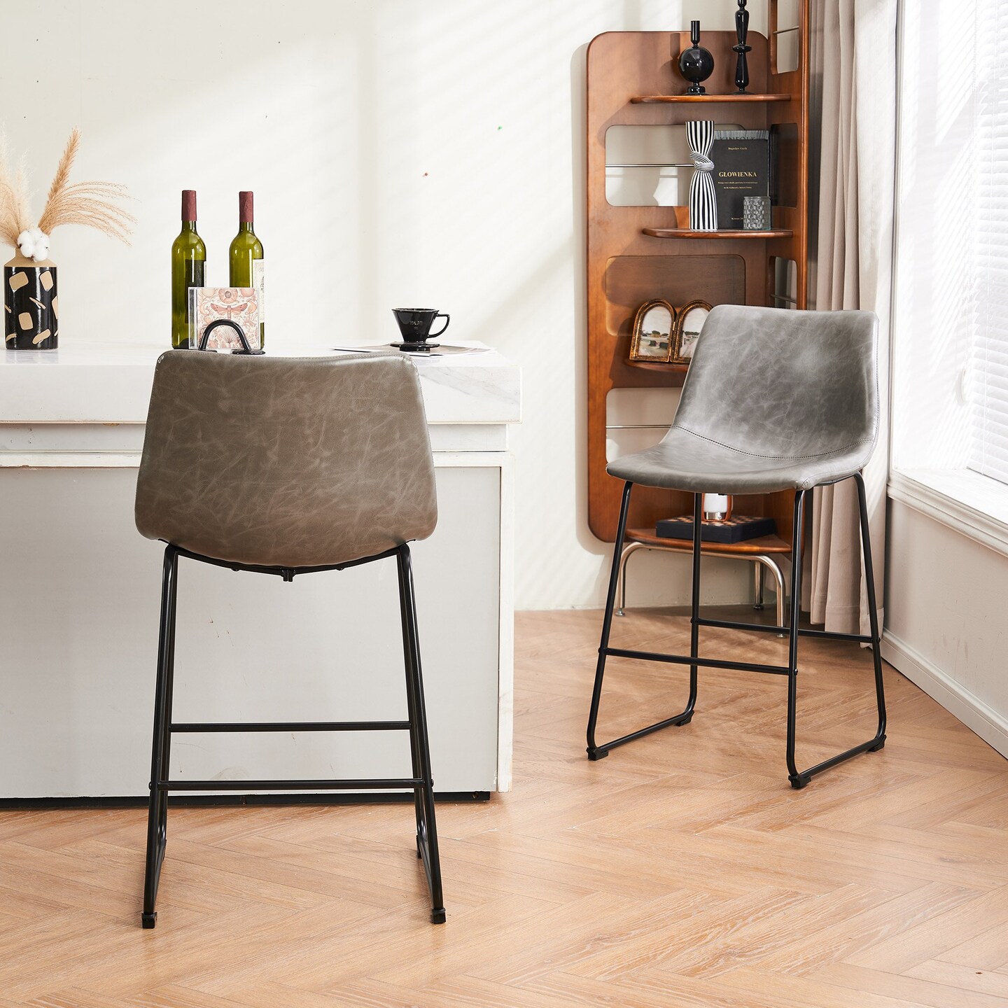 Modern Faux Leather Bar Stools Set Of 2 26 Inch 30 Inch Counter Height Metal Frame