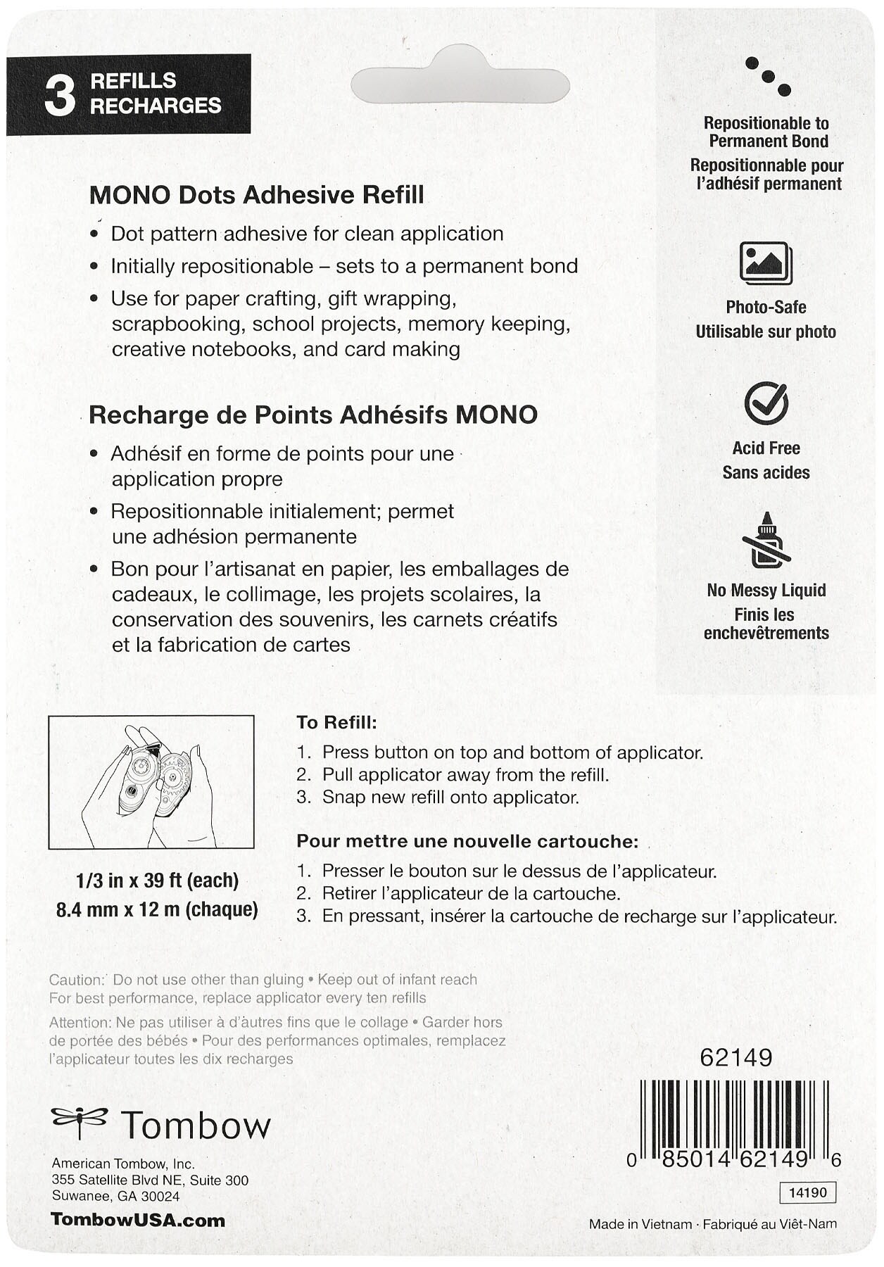 Mono Adhesive Dots Refill Permanent Value Pack 3/Pkg-.33"X39' Each, For Use In 62147