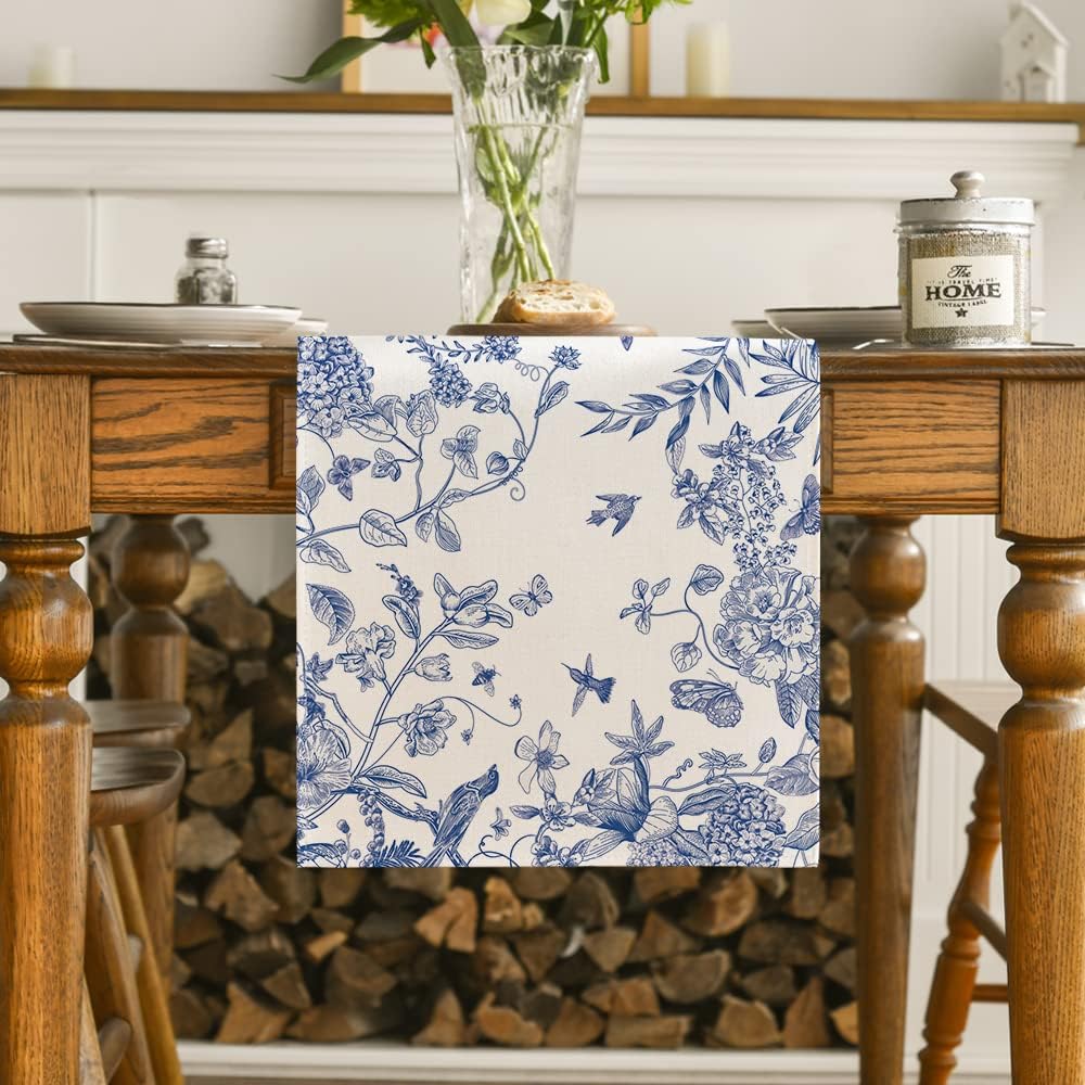 Monochrome Sketch Birds and Flowers Spring Table Runner – Seasonal Summer & Fall Kitchen Dining Table Decoration for Home Party Decor, 13 x 108 Inch