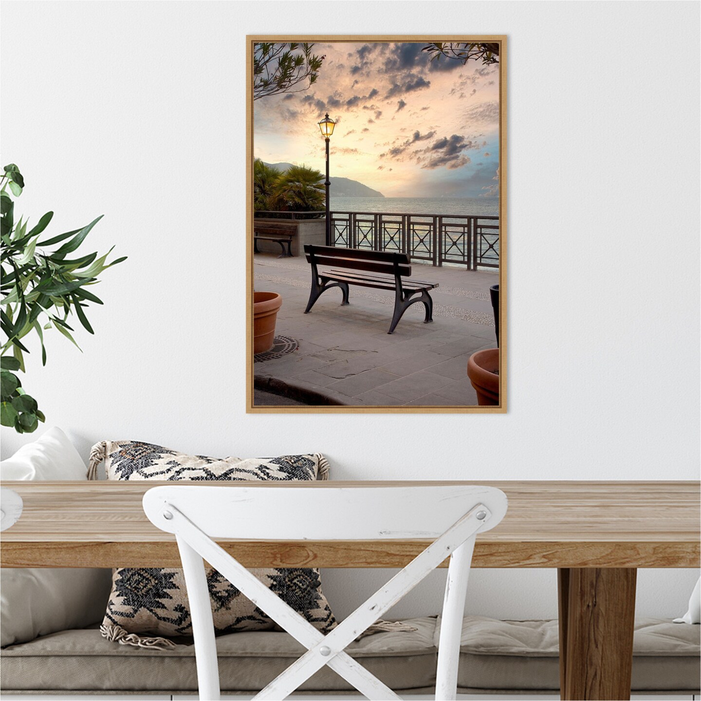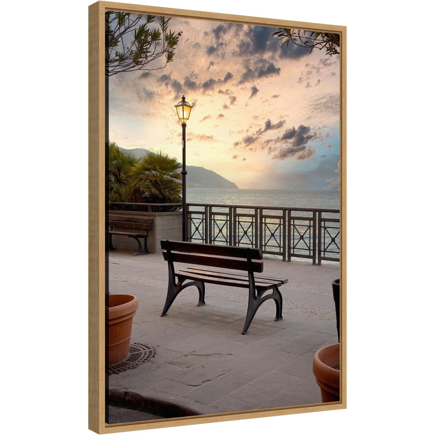 Monterosso Italy Bench at Sunrise by Alan Blaustein 16-in. W x 23-in. H. Canvas Wall Art Print Framed in Natural