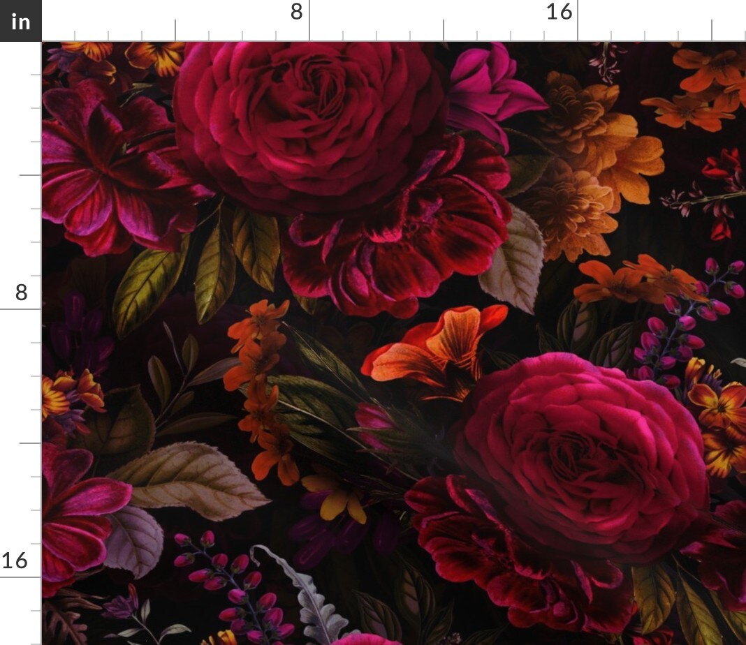Moody Floral Gothic Flower Maximalist Bouquet Dark Red English Rose Nostalgic Large Scale Custom Printed Fabric by Spoonflower Various Fabrics by the Yard or Fat Quarter