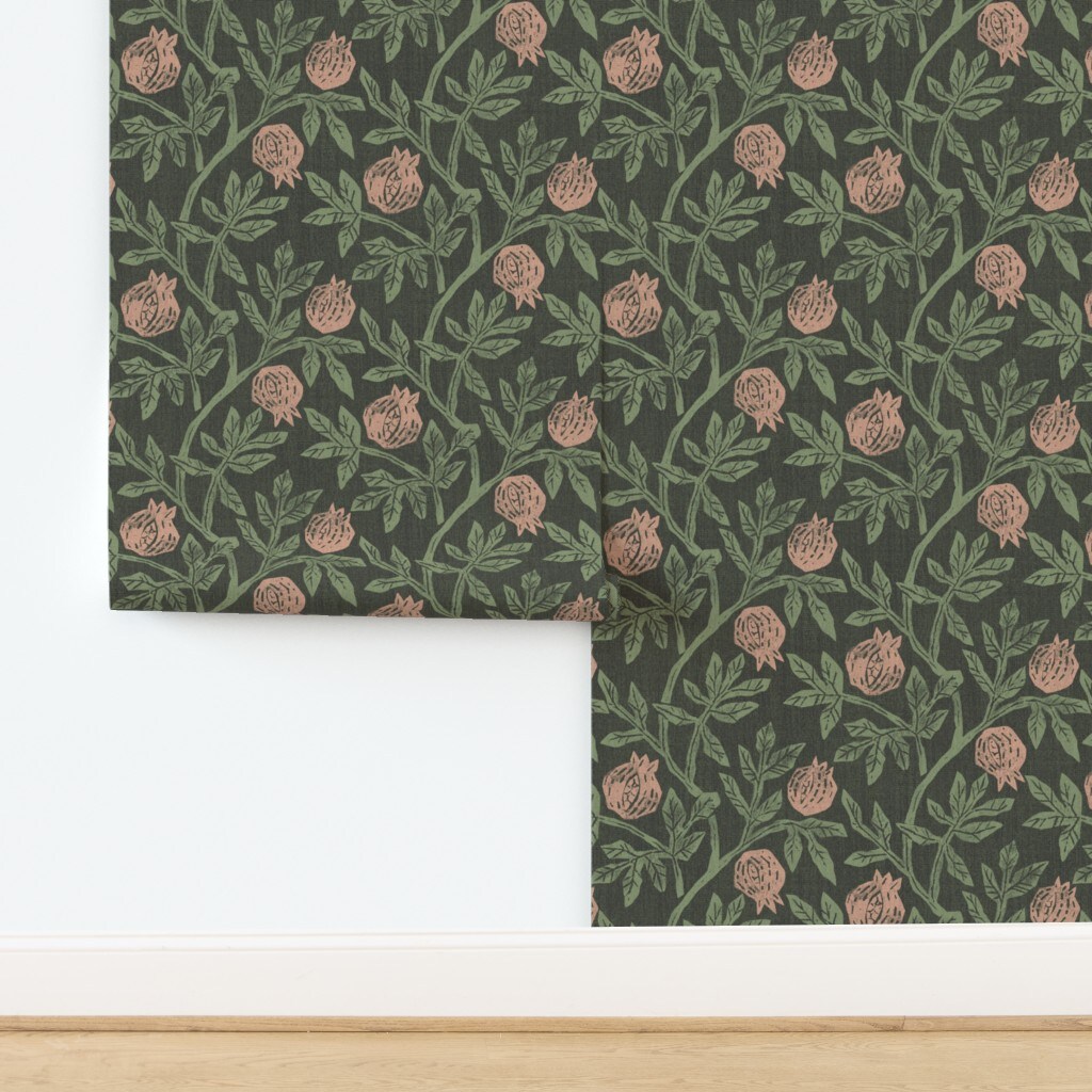 Moody Pomegranate Modern Botanical Fruit Arts And Crafts Nouveau Vintage Style Retro Green Custom Pre-pasted Wallpaper by Spoonflower Pre-Pasted Wallpaper 2FT Wide