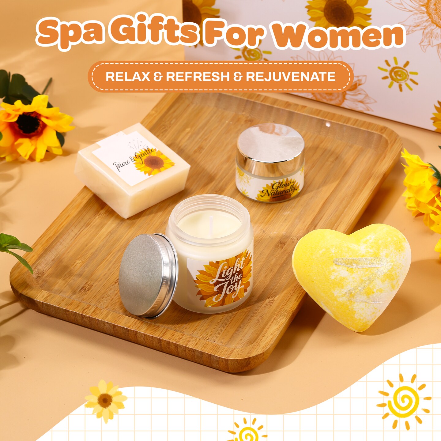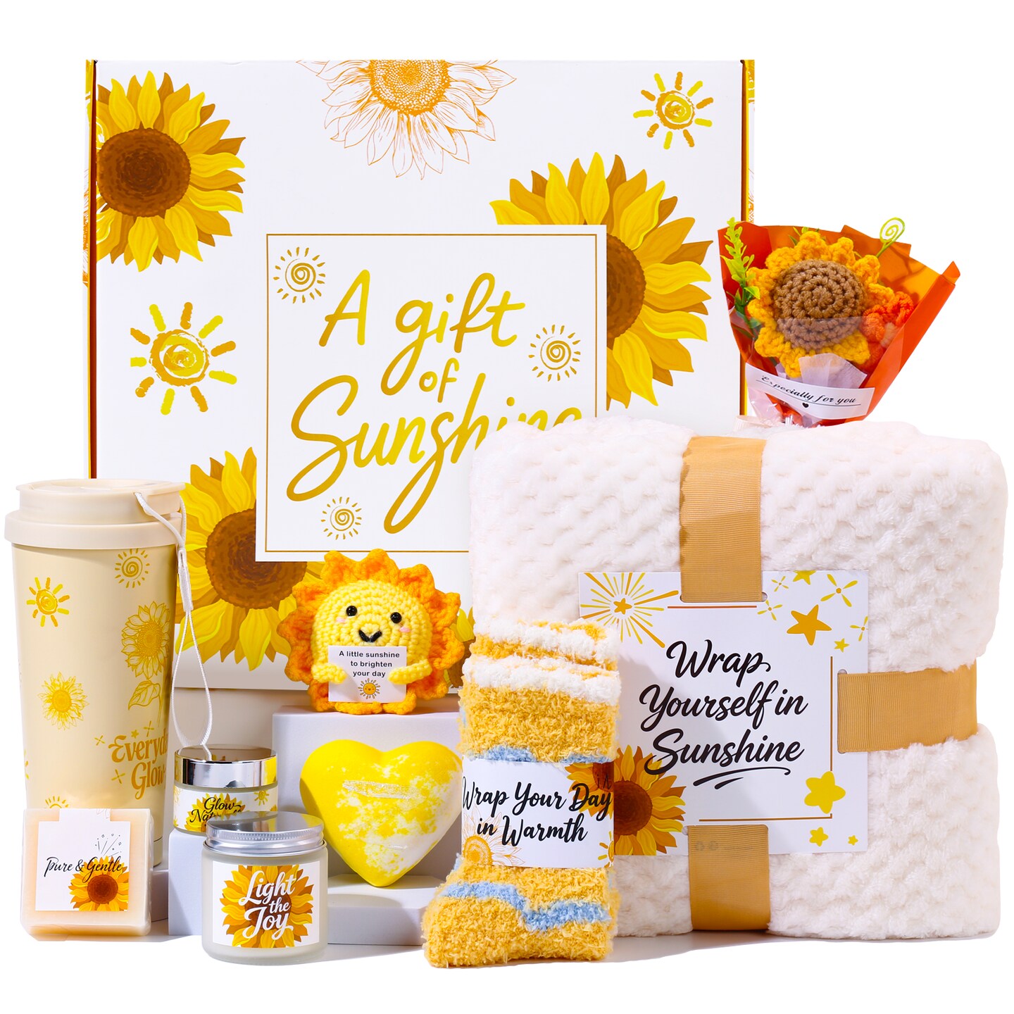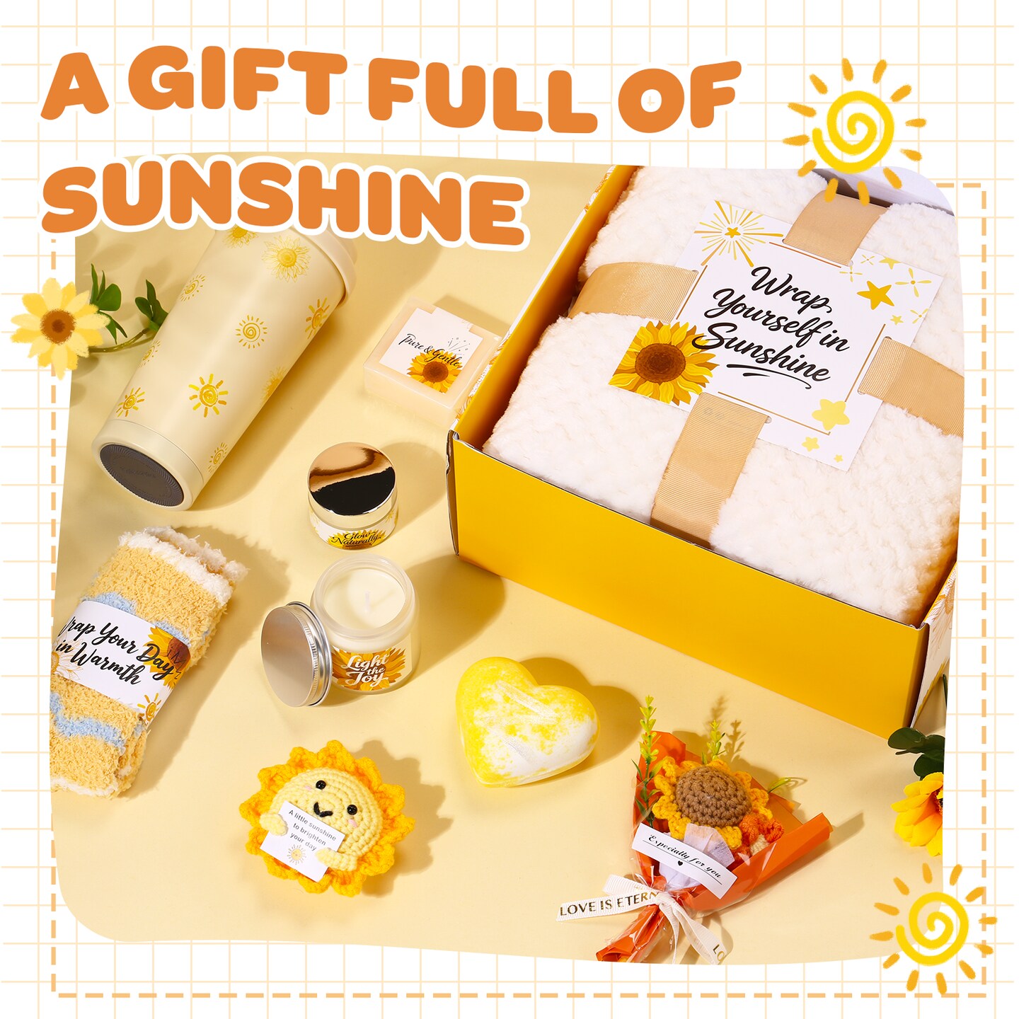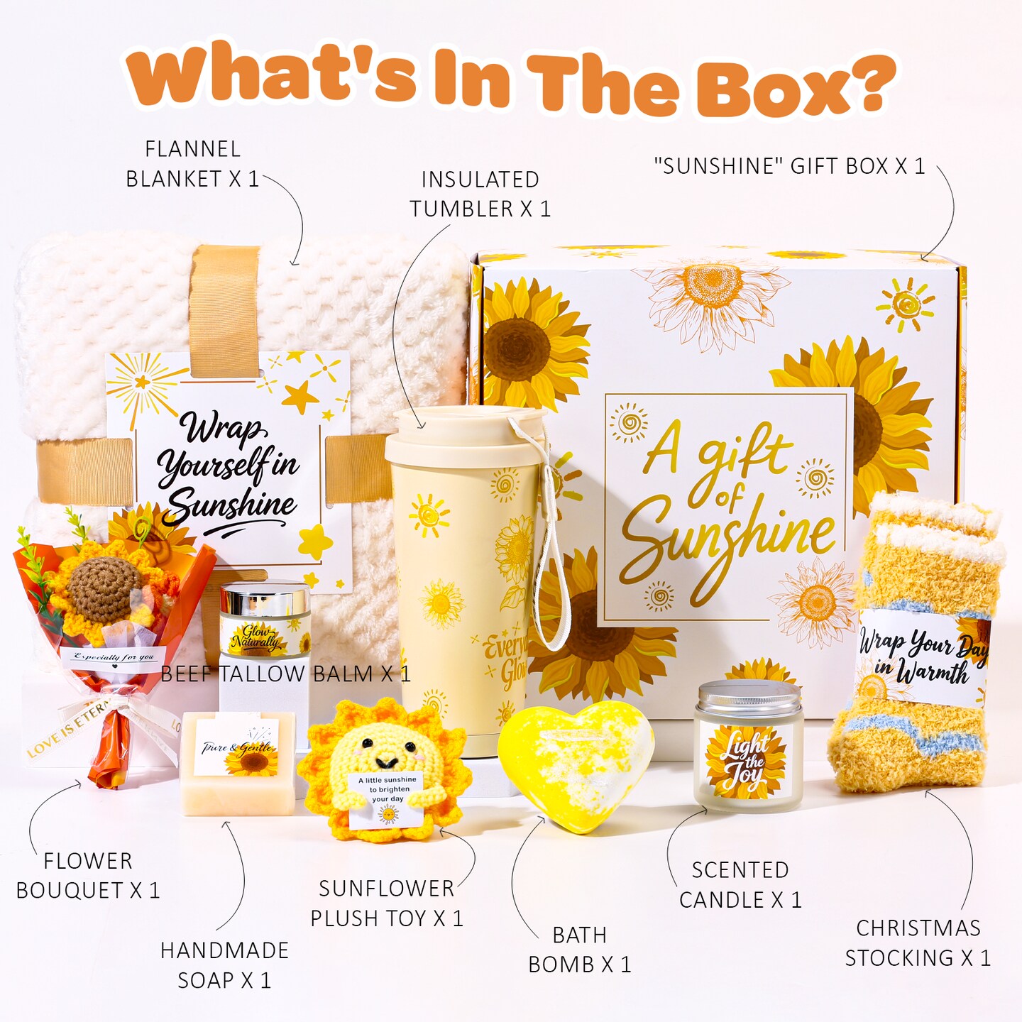 Mother's Day Gift - Sunflower Gift Box for Women, 9-in-1 Sunshine Luxury Self Care Package with Blanket, Tumbler, Candle, Bath Bomb, Plush & More, Get Well Soon, Birthday Day Gifts