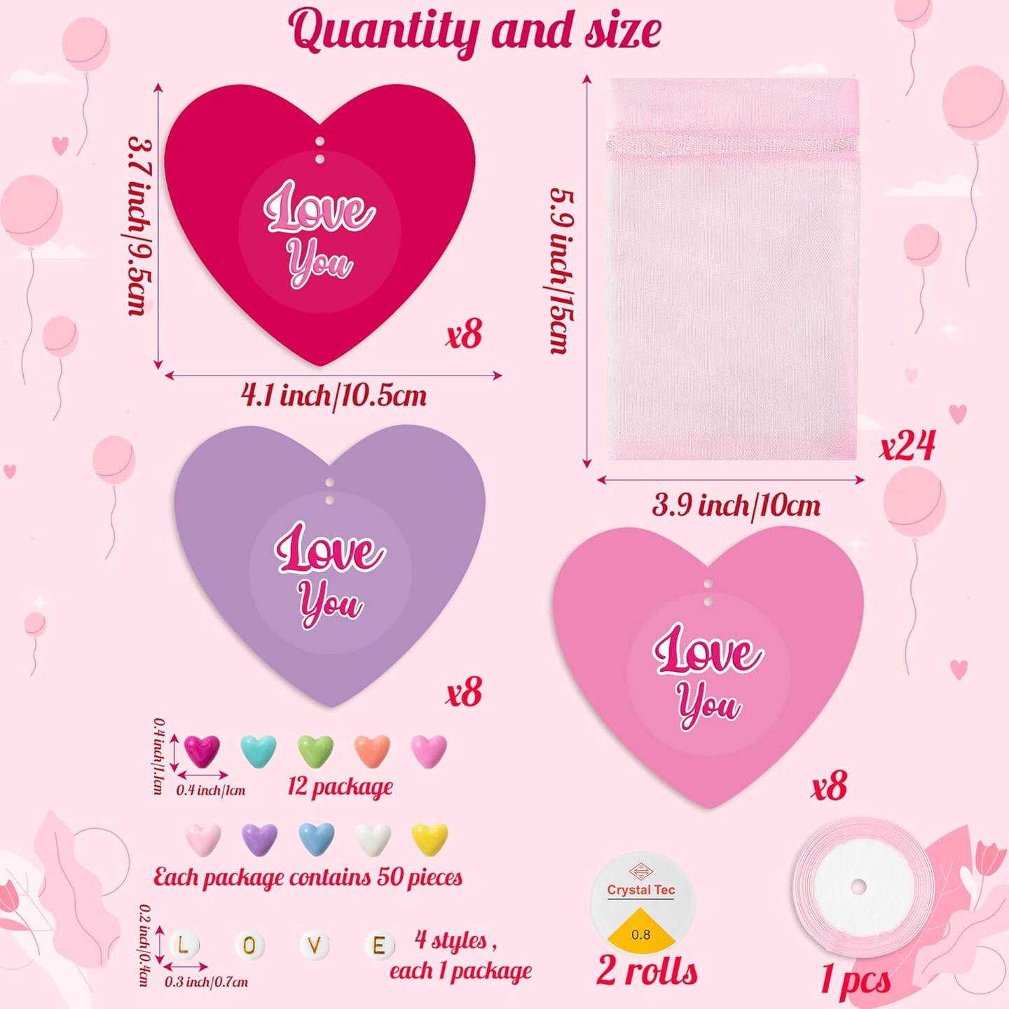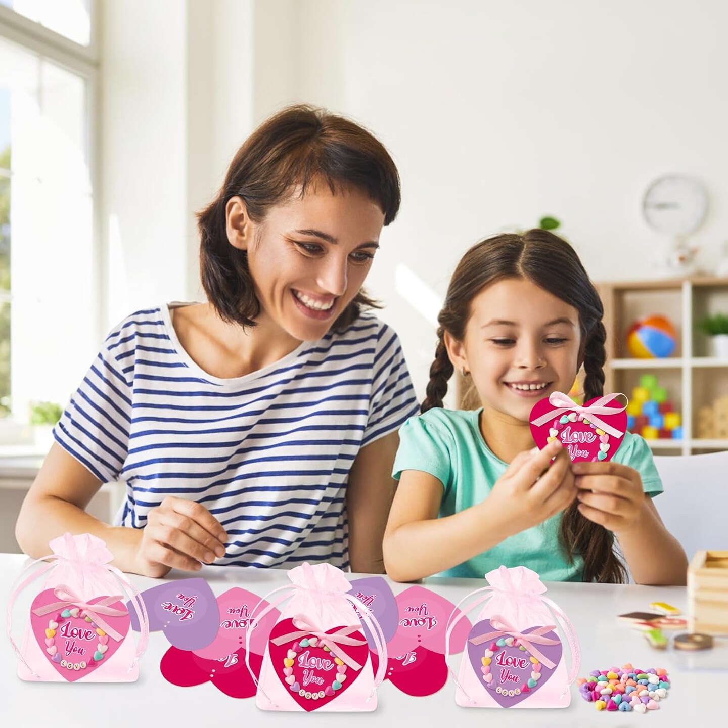 Mother’s Day Card Making DIY Bracelet Craft Kit for Kids – 24 Pack LOVE Letter Beads Bracelet Set with Heart Greeting Cards, Gift Bags & Elastic String for Classroom & Party Activities (Ages 6–12)