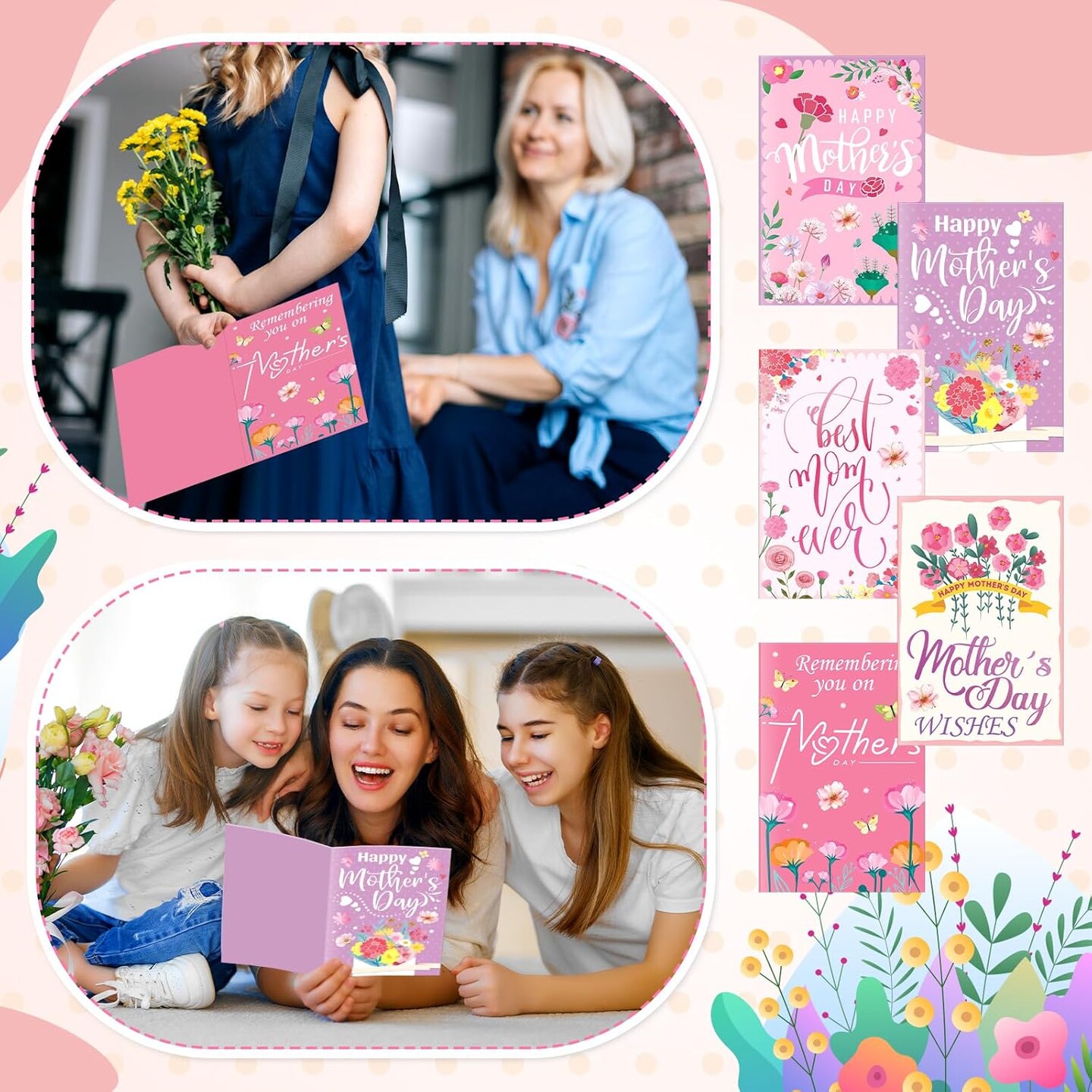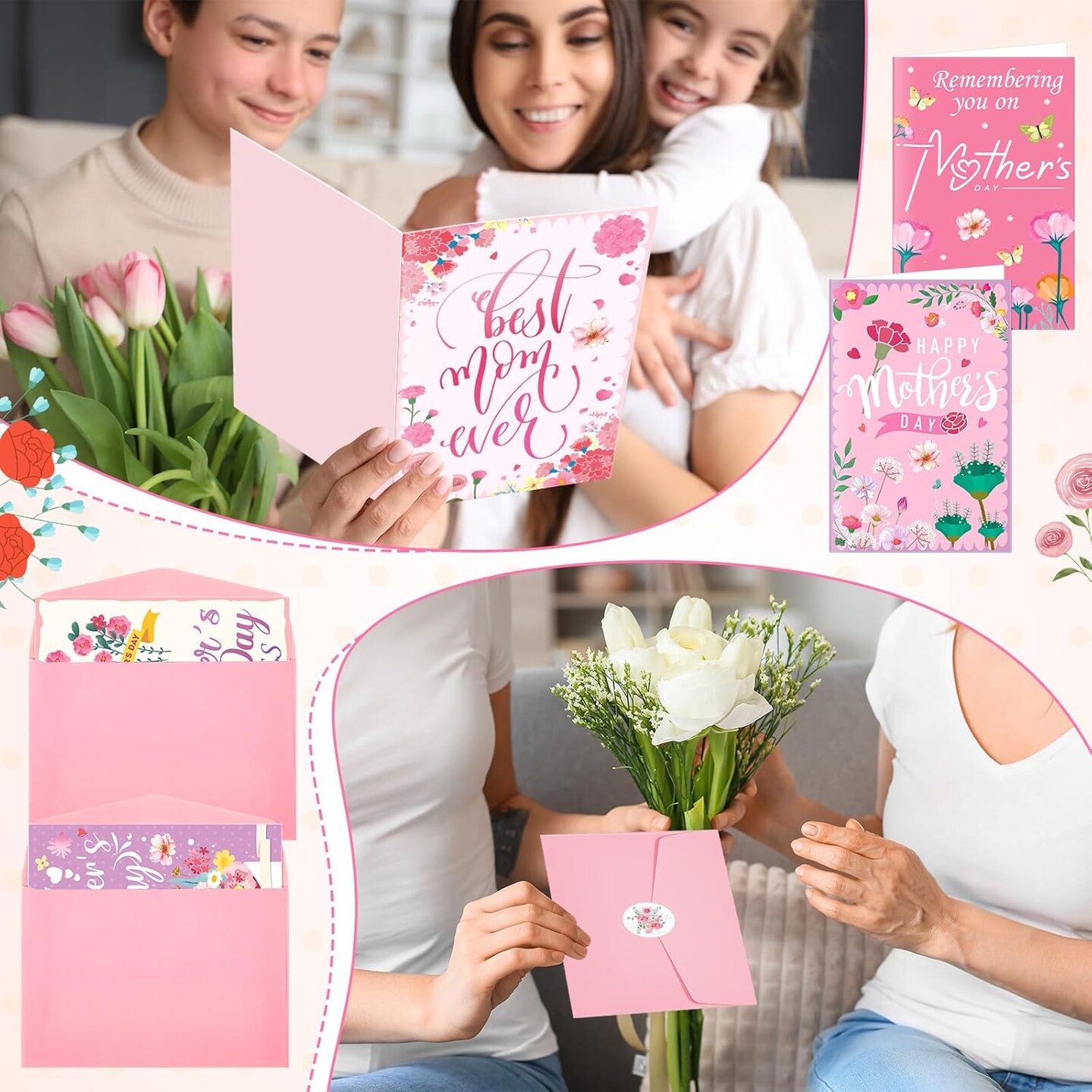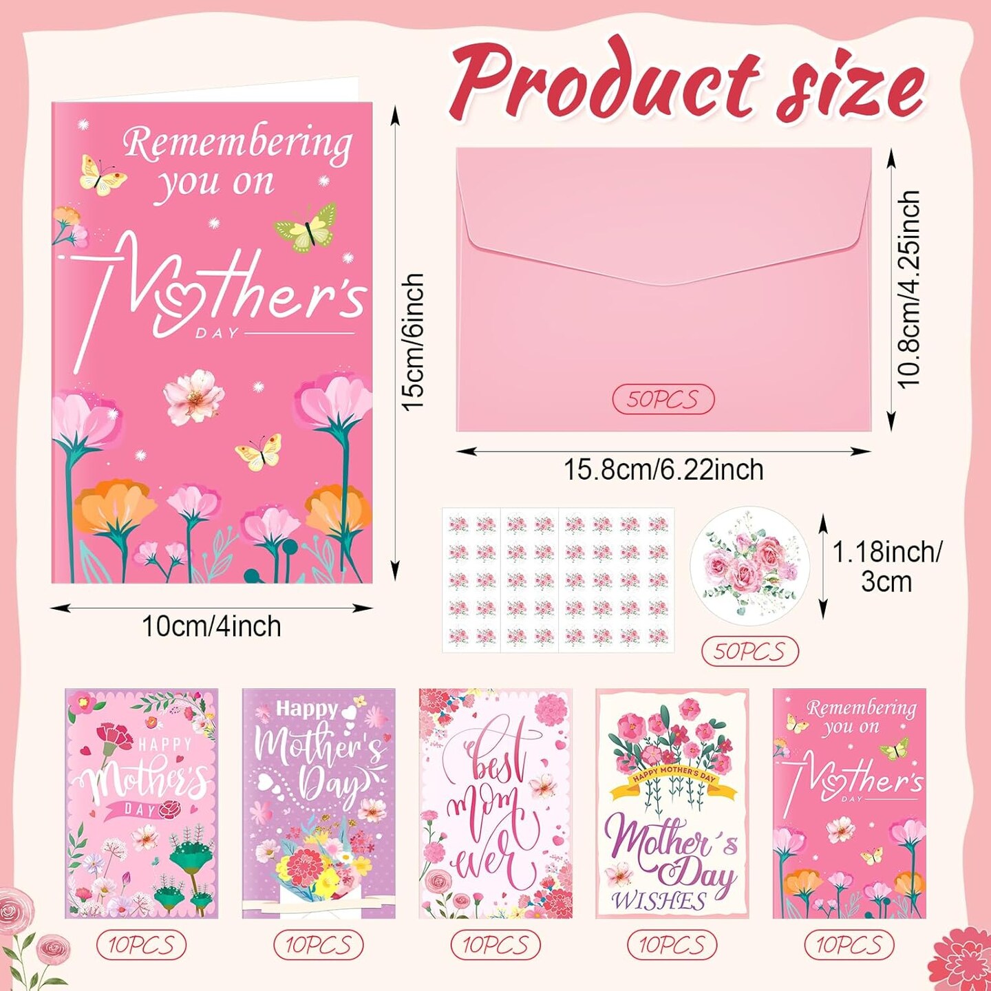 Mother’s Day Card Making Greeting Card Set – 50 Pack Blank Inside Cards with Envelopes & Stickers, 5 Assorted Funny Floral Designs 4×6 Inch Bulk Gift Set