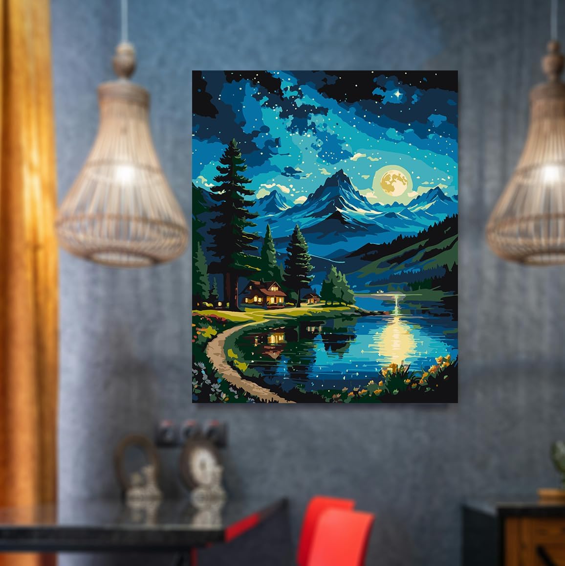Mountain Paint by Numbers Kit for Adults Lakeside Cabin Adult Paint by Number Kits On Canvas Moon Night Oil Painting Kit for Beginners Adults Kits for Gift Home Wall Decor 16x20 Inch