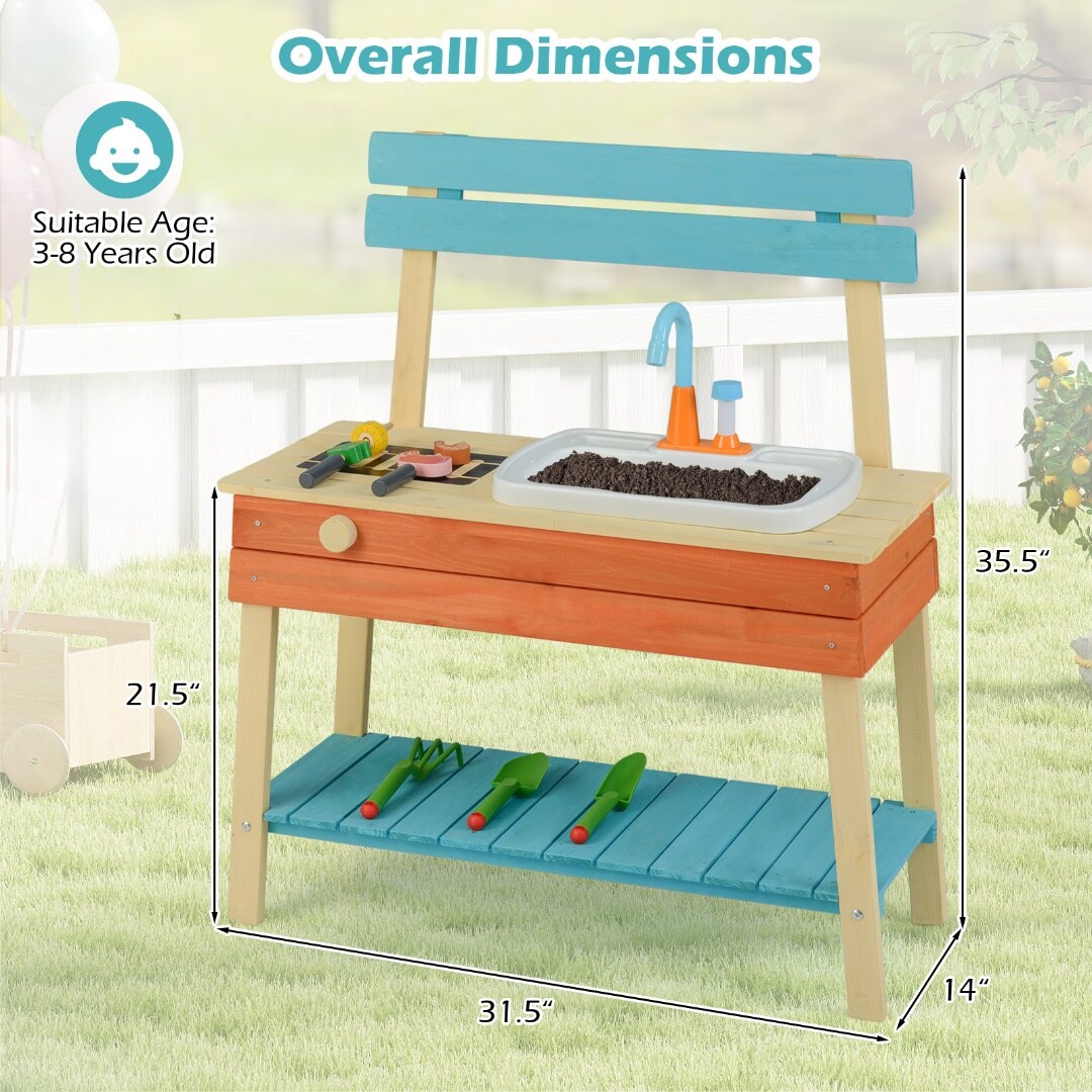 Multi-Color Kids Outdoor Mud Kitchen with Grill Sink Faucet Fir Pine Wood 31 Inch