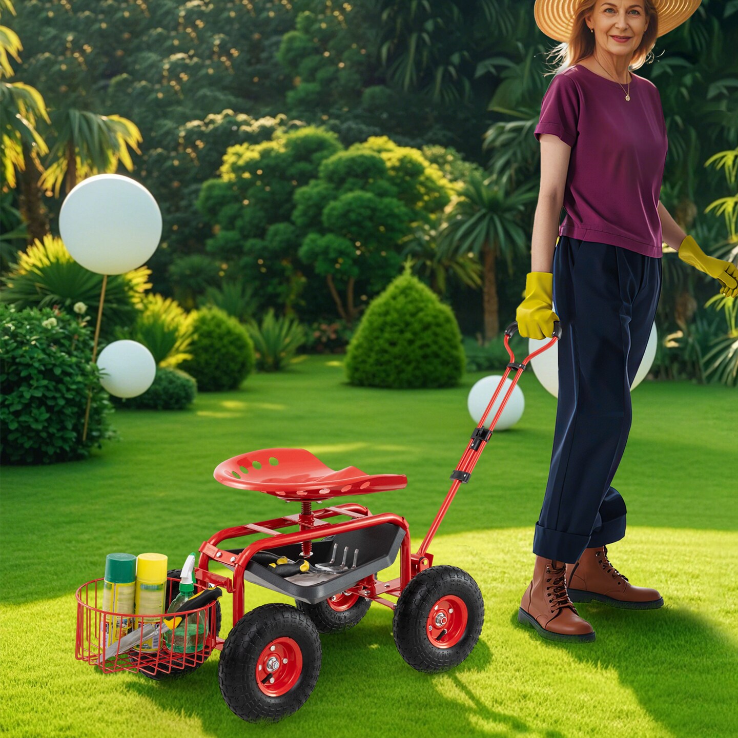 Multi-functional Garden Scooter Adjustable Swivel Seat Cart with Storage Basket and 10" Rubber Wheels