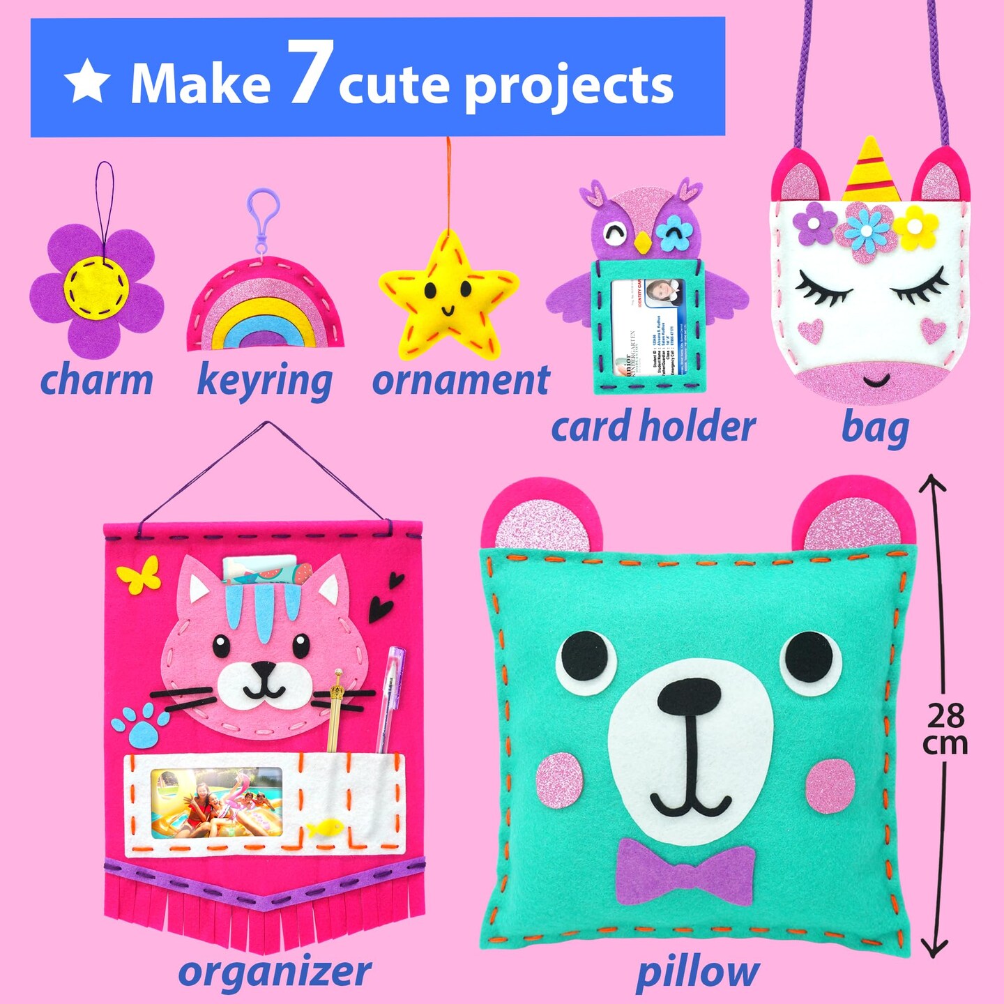 My First Sewing Kit for Beginner Kids Arts & Crafts, 7 Easy DIY Projects of Stuffed Animal Dolls and Plush Pillow Craft, Instructions & Felt, Gift for Girls, Boys, Learn to Sew, Embroidery