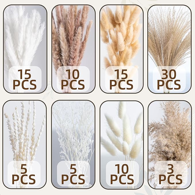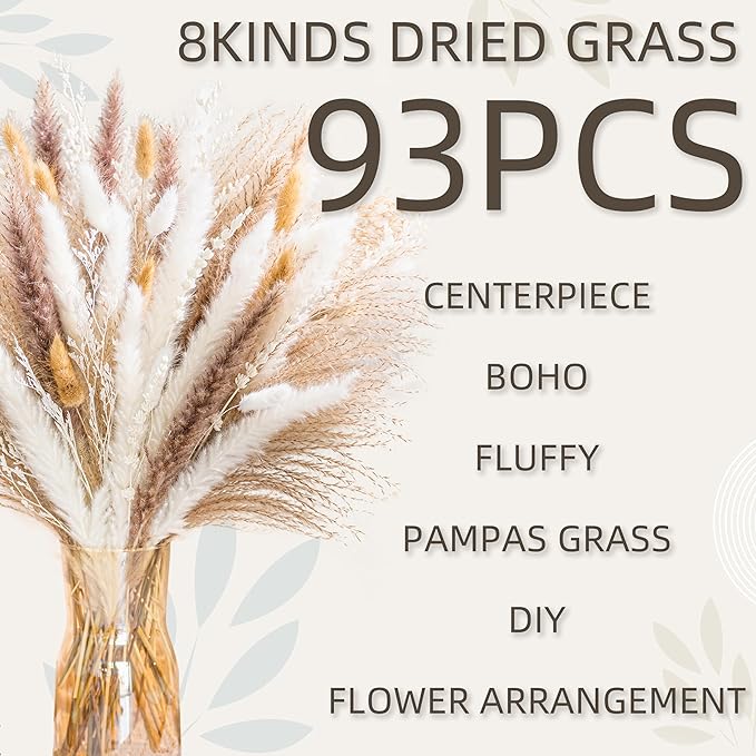 Natural Pampas Grass 8kind Grass Mix Bouquet | Dried Pampas Bouquet for Wedding Boho Flowers Home Table Desk Decor, Rustic Farmhouse Decor (93PCS)