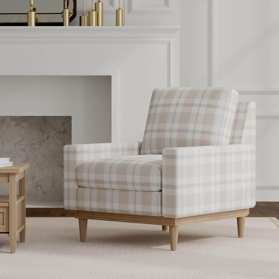 Natural Stain Resistant Performance Pet Friendly Plaid Woven Pattern Upholstery Fabric by The Yard - SKU: Aimes Beige