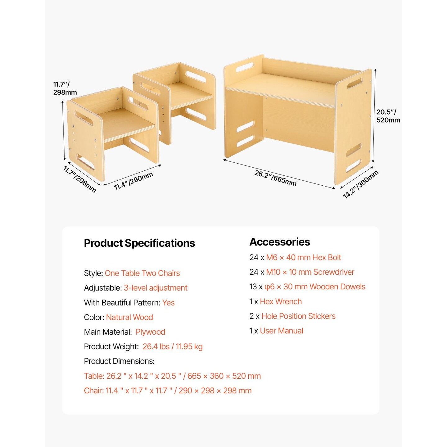 Natural Wood Montessori Kids Table and Chair Set with 3-Level Adjustable Height for Playroom