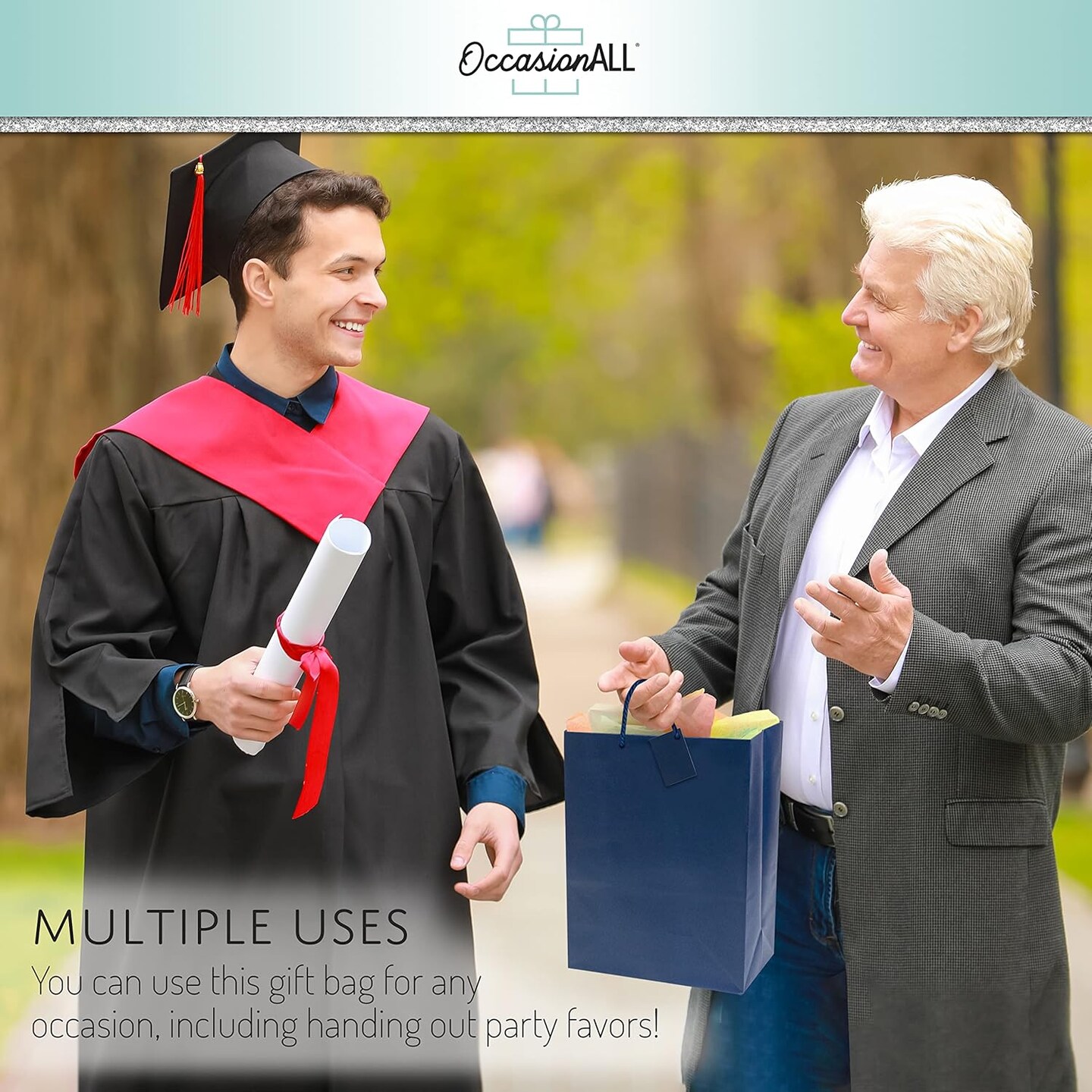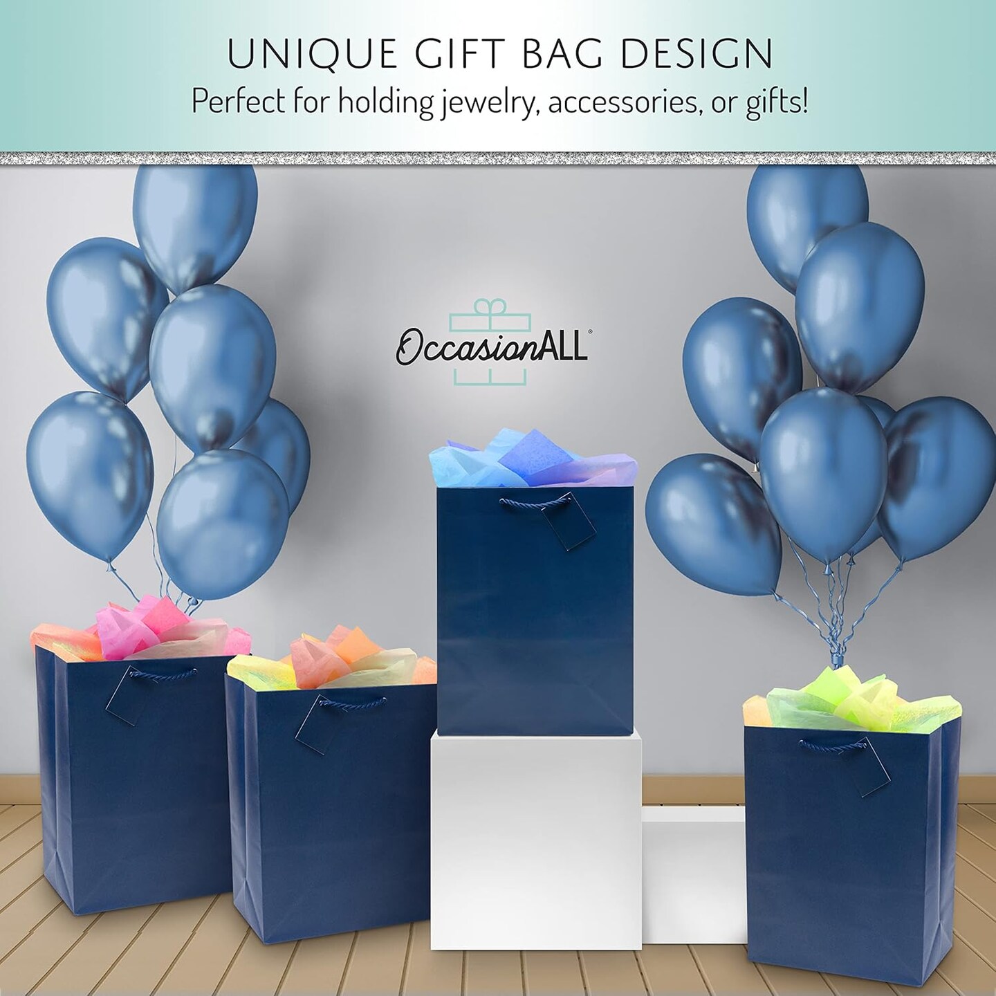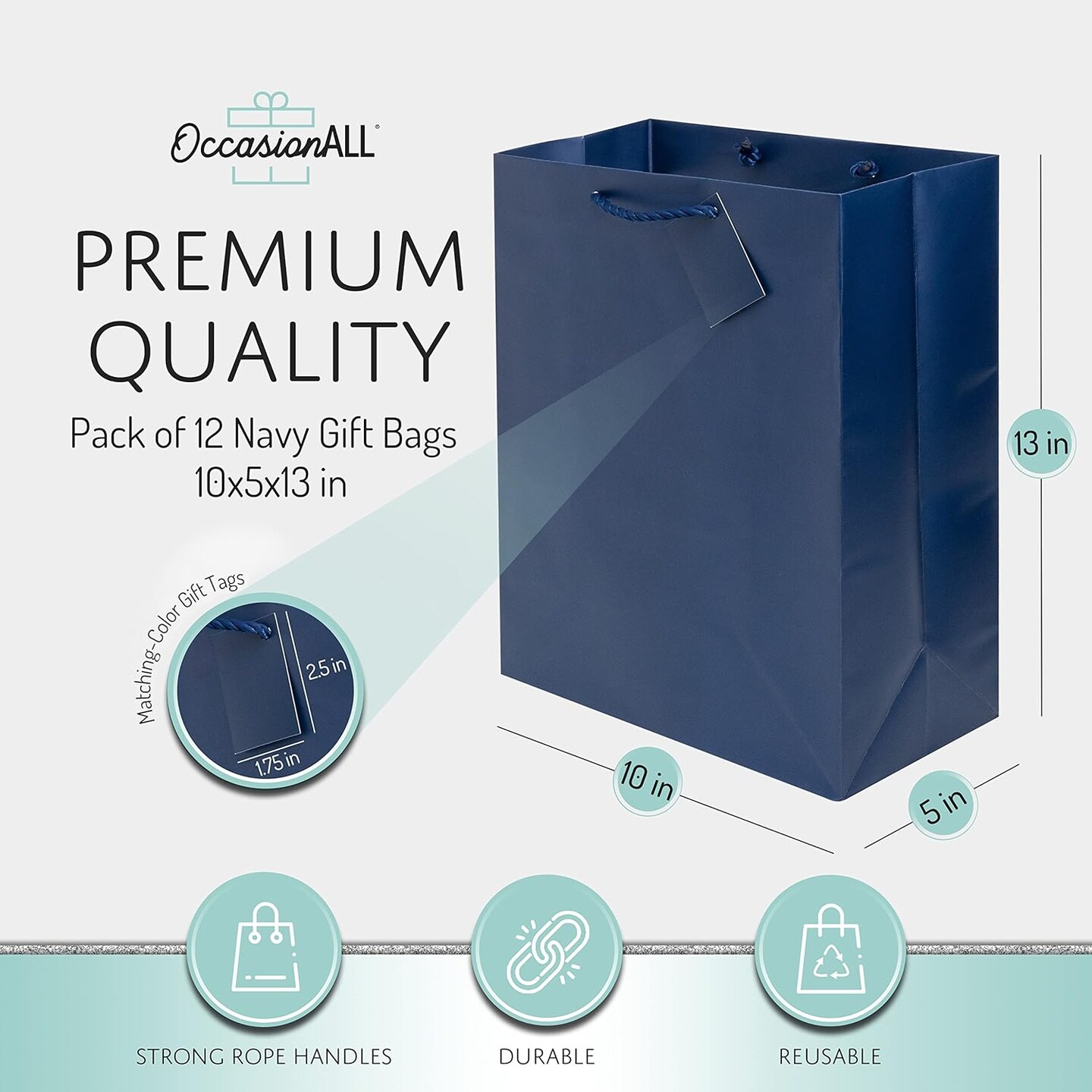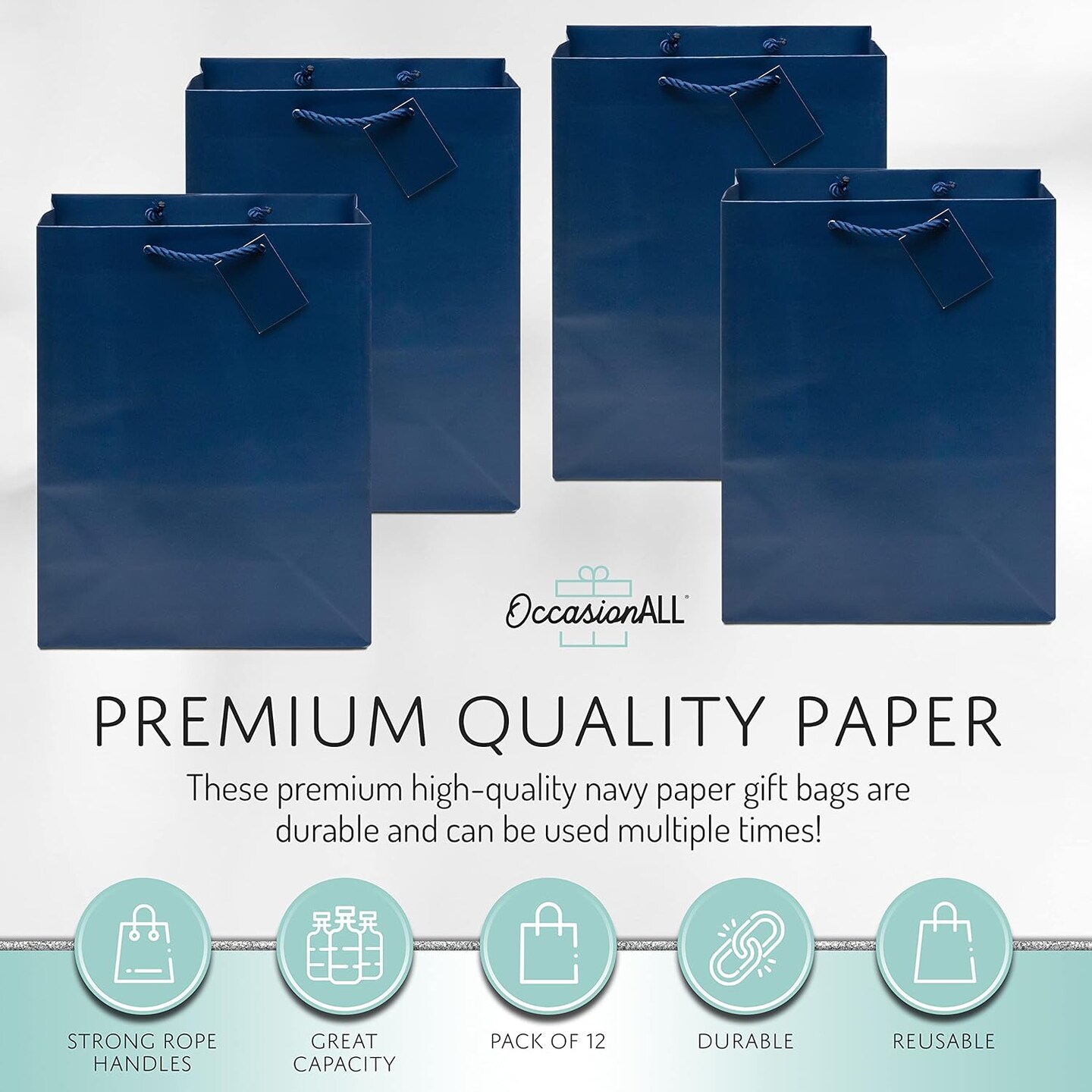 Navy Blue Gift Bags with Handles, Large Totes for Small Business, Party Favors, Christmas Wrap, Goodies, Shopping, Bulk, 10x5x13 12 Pack