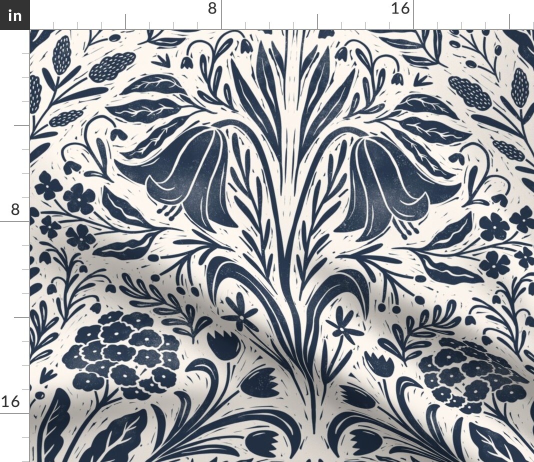 Navy Flowers Cream Blue Botanical Block Print Summer Garden Cottagecore Custom Printed Fabric by Spoonflower Various Fabrics by the Yard or Fat Quarter