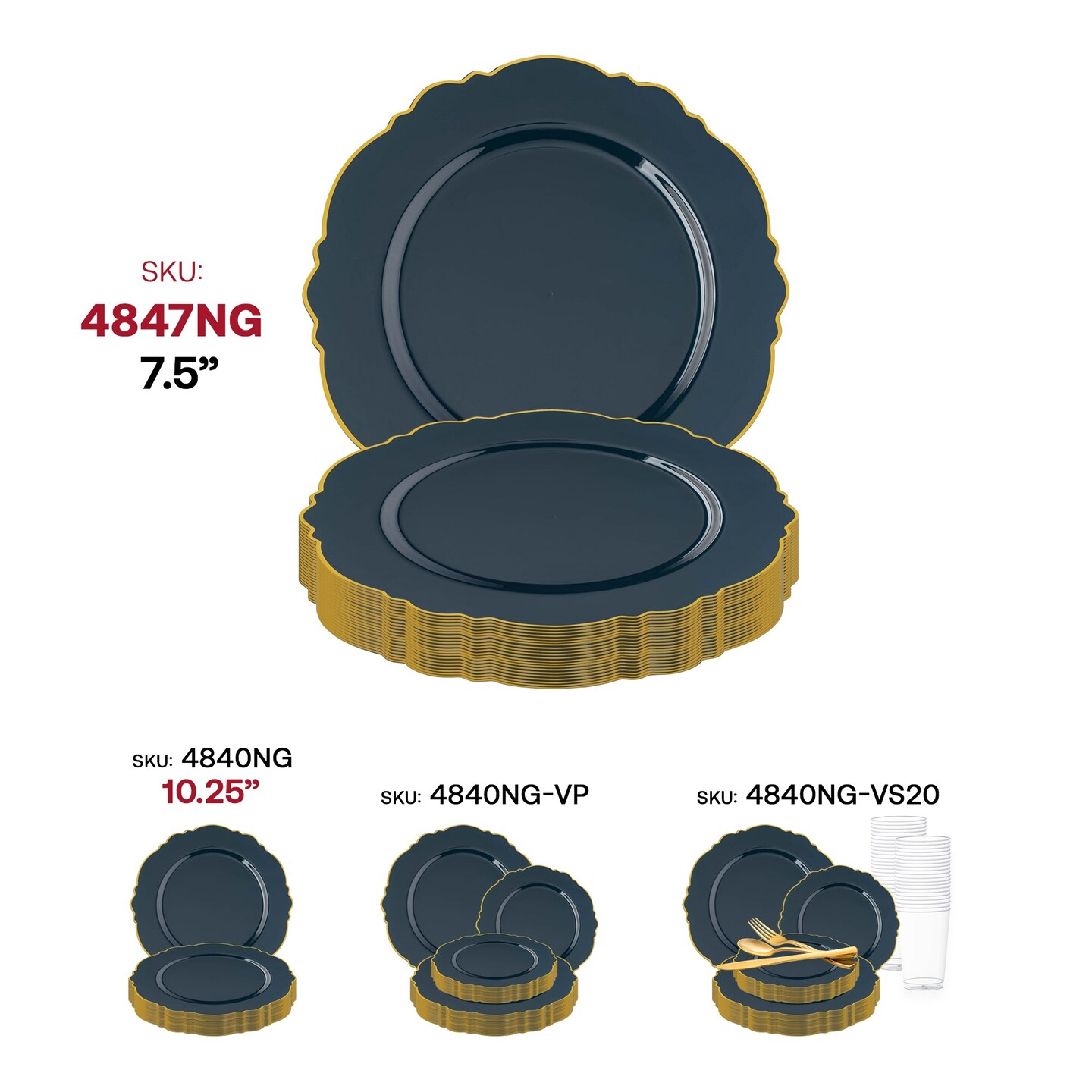 Navy with Gold Rim Round Blossom Disposable Plastic Appetizer/Salad Plates - 7.5" (120 Plates)
