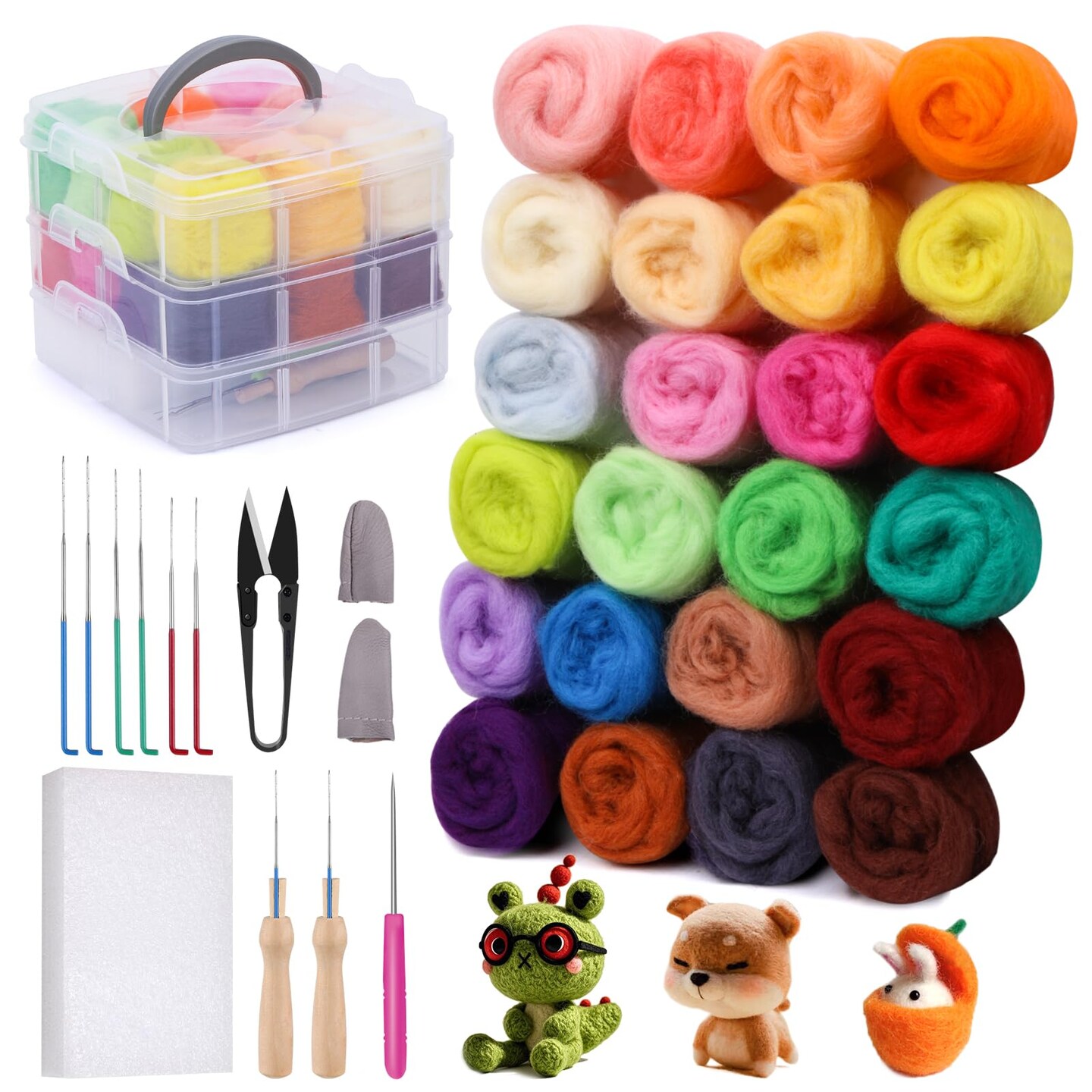 Needle Felting Kit, 24 Colors Wool Roving (5g/Color), Complete Needle Felting Starter Kit with Needle Felting Supplies Wool Fibre Spinning Craft Felting Kits for Beginners