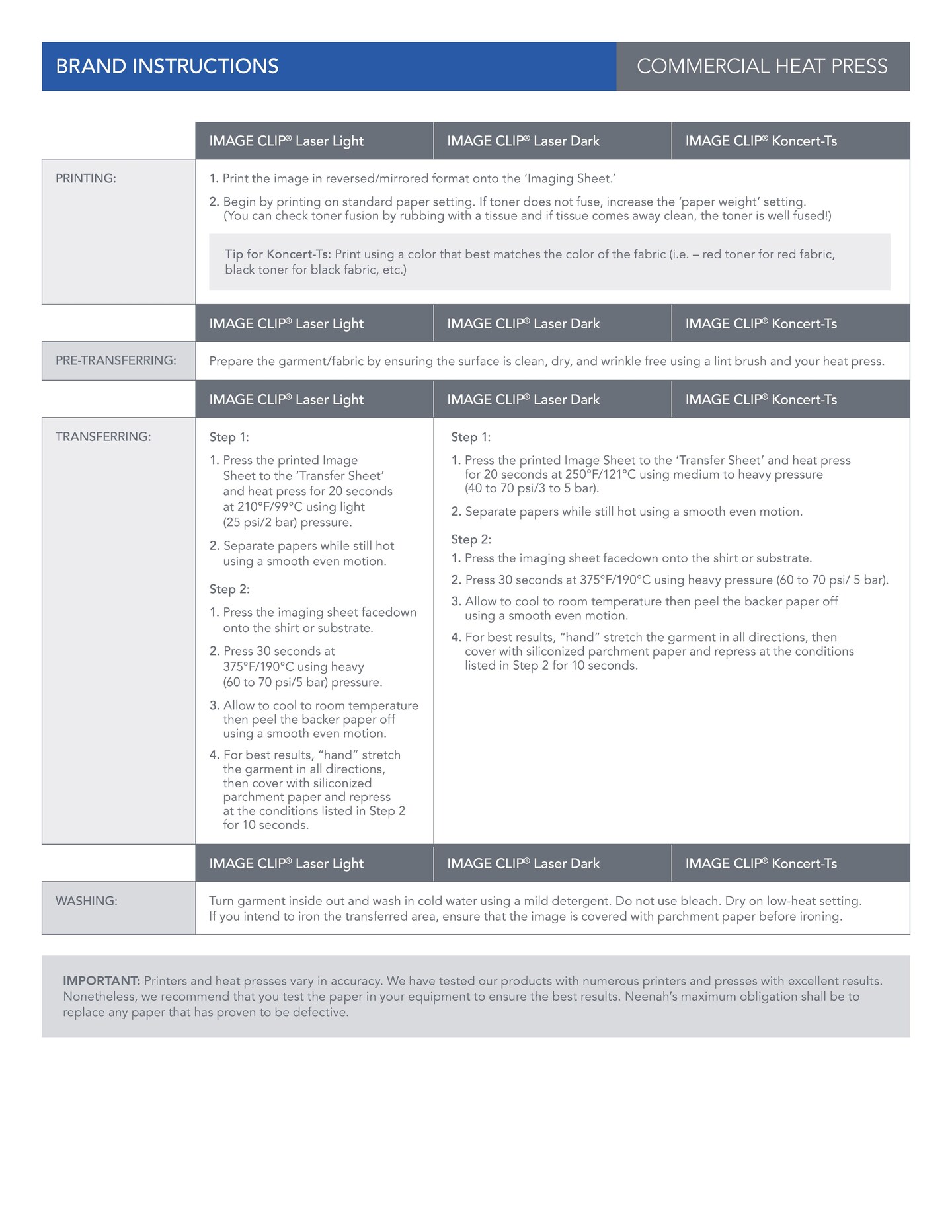 Neenah ImageClip Koncert Ts - Transfer paper for Laser Printer / Dark Colored Garments Sheets 8.5"x11" Made in USA