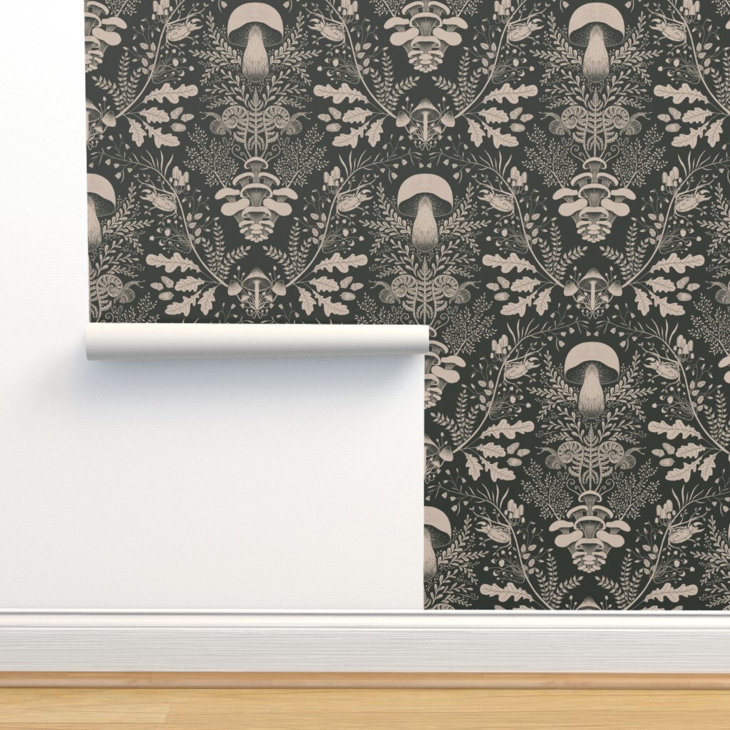 Neutral Woodland Dark Green Cream Beige Forest Damask Mushroom Gray Custom Removable Wallpaper by Spoonflower Peel & Stick Wallpaper 2FT Wide