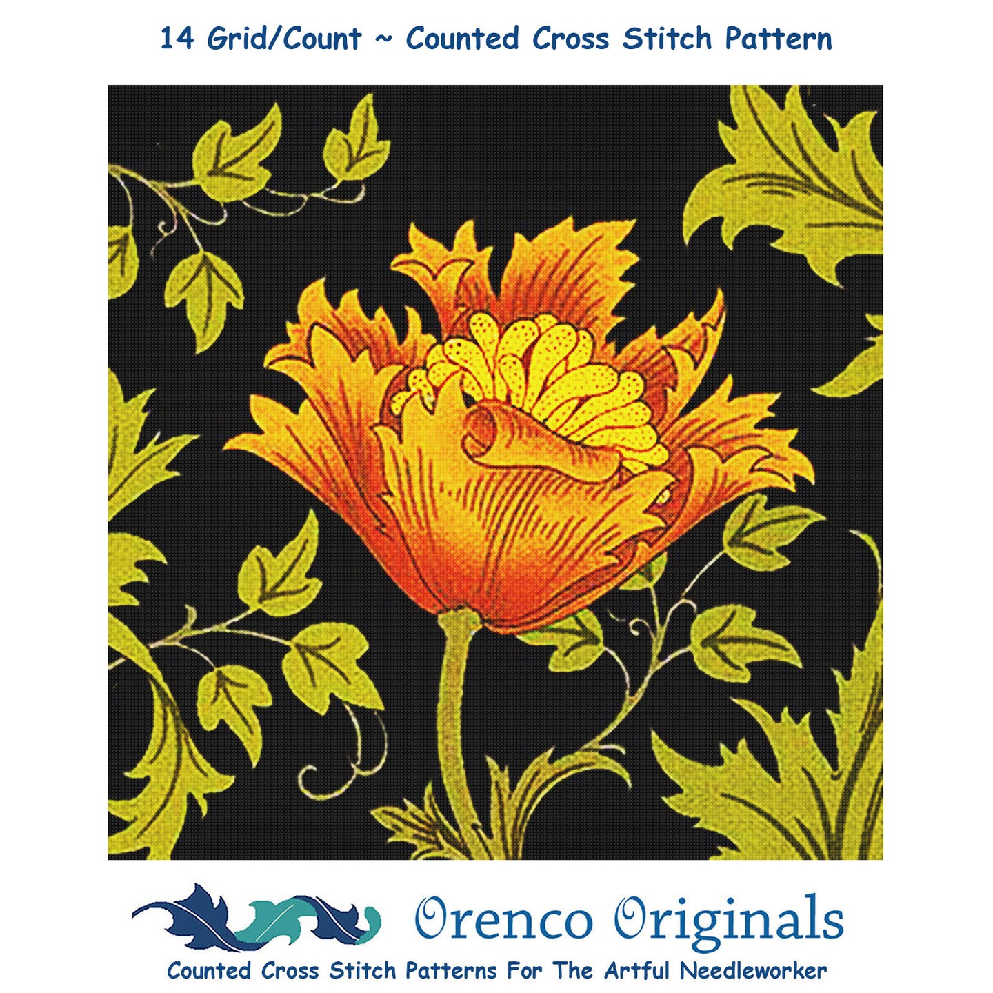 New William Morris Orange Anemone Flower on Black Counted Cross Stitch Pattern
