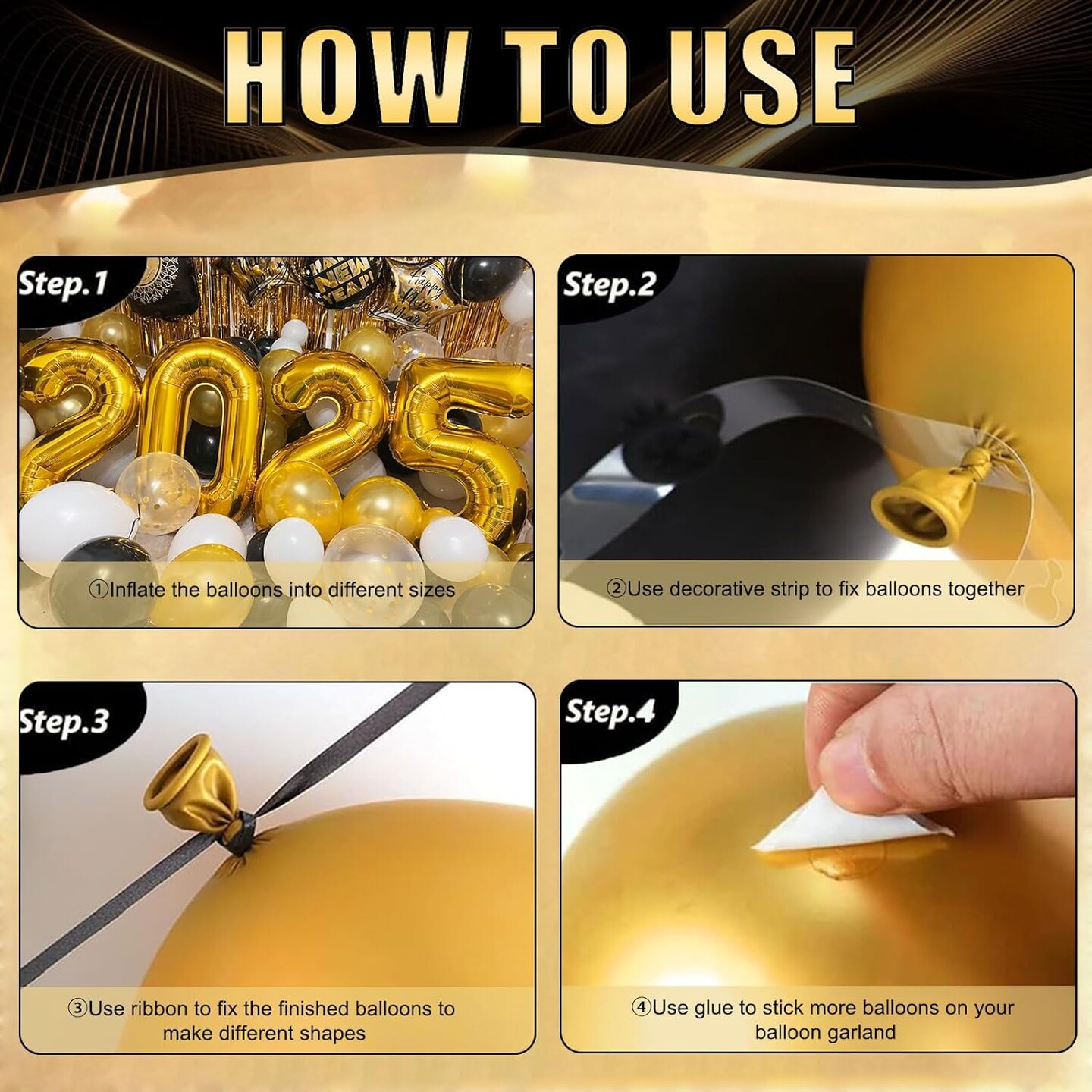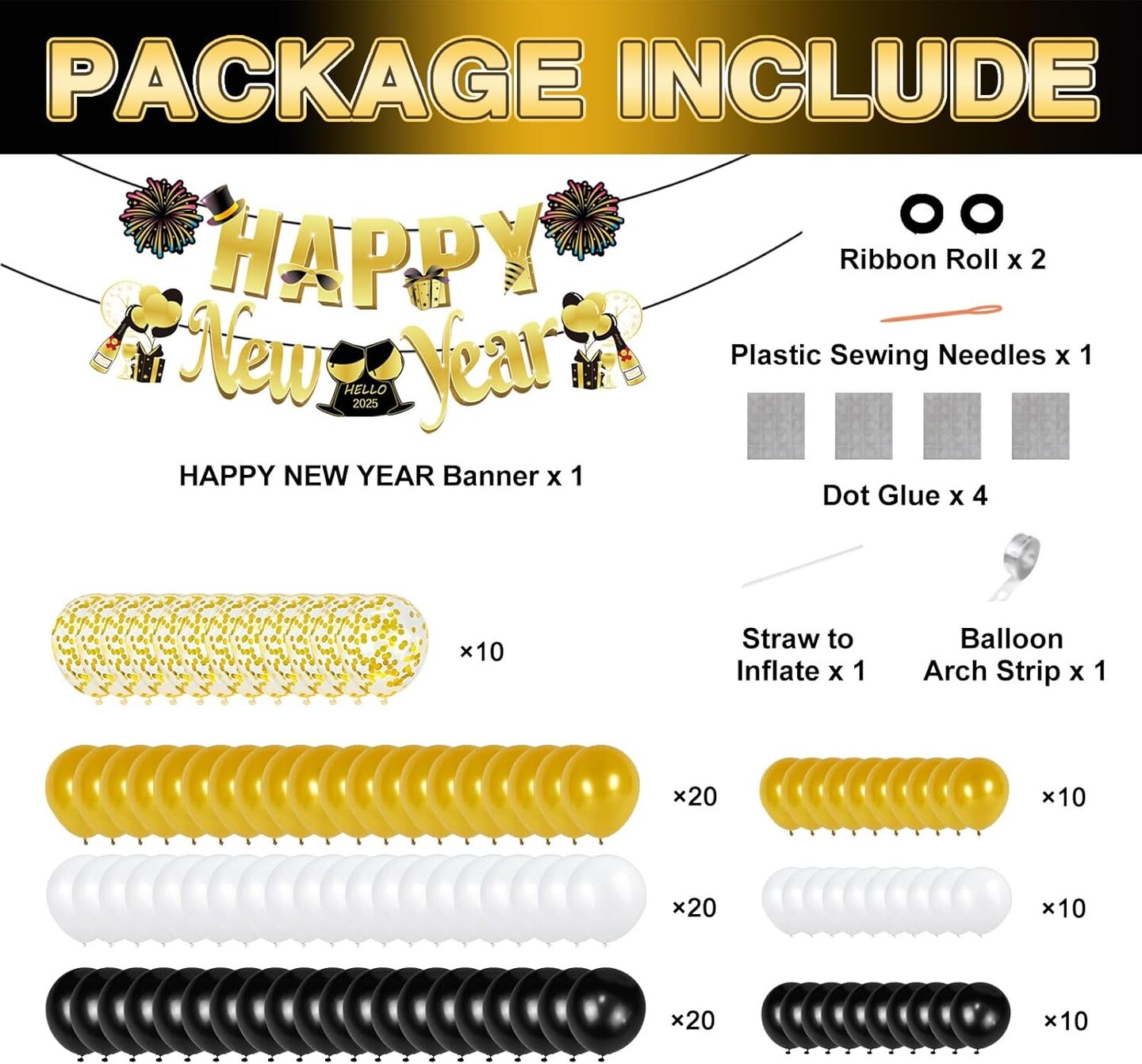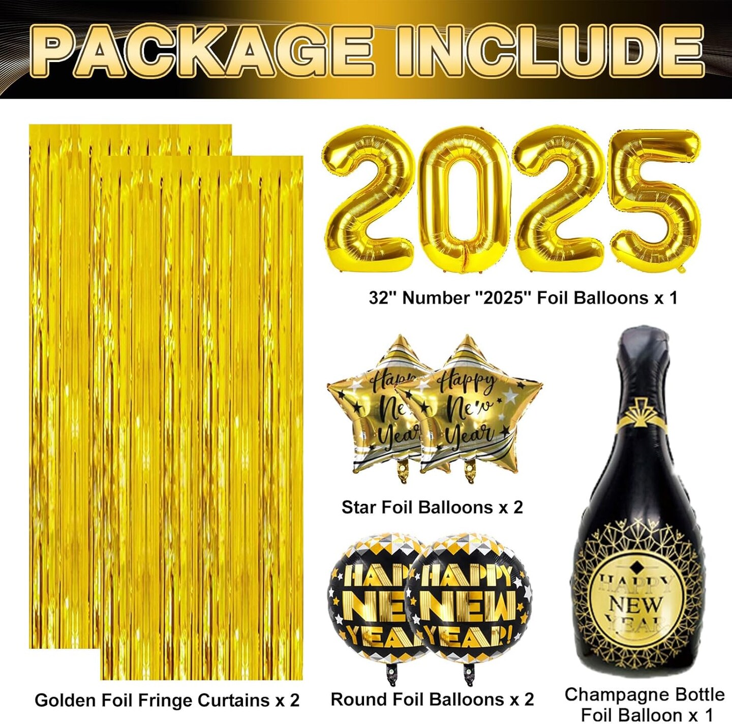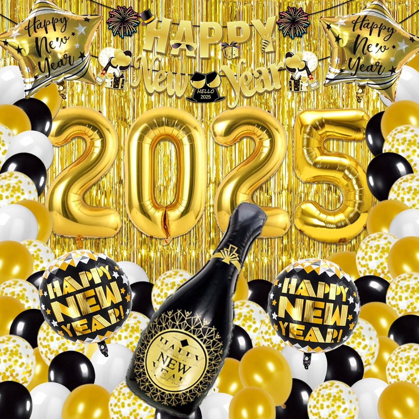 New Years Eve Party Supplies 2025, 121pcs New Years Decorations, NYE Decorations 2025 with Happy New Year Banner, 2025 Balloons, Fringe Curtains, Foil Balloons for Happy New Year 2025