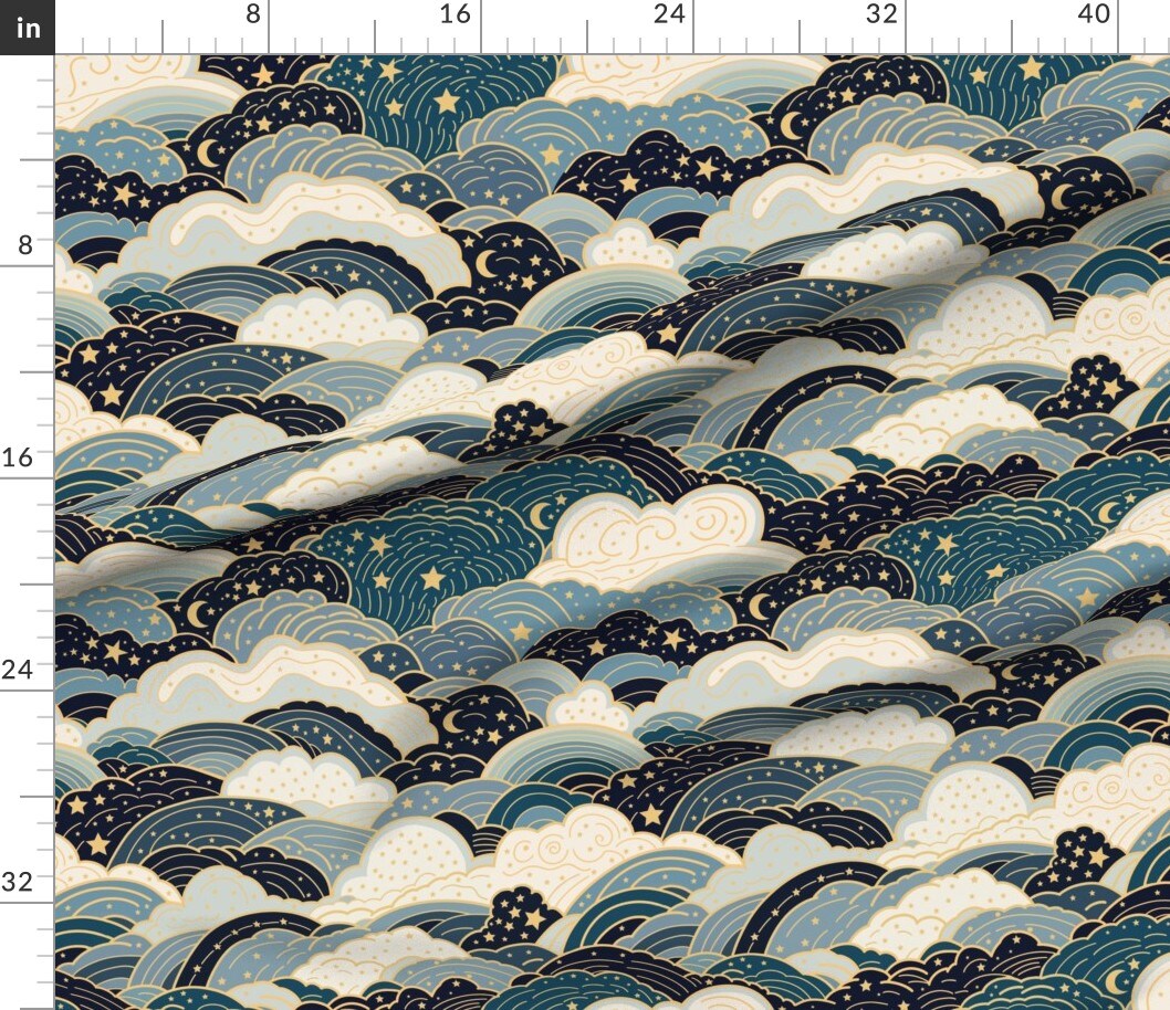 Night Sky Blue Yellow Sleepy Clouds Stars Moon Serene Celestial Custom Printed Fabric by Spoonflower Various Fabrics by the Yard or Fat Quarter