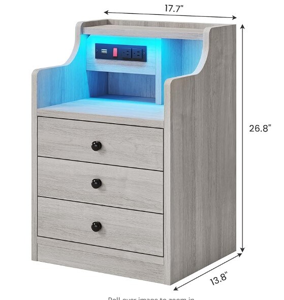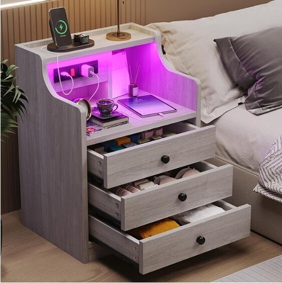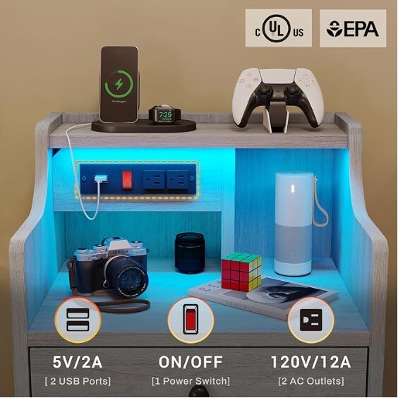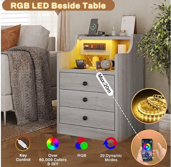 Nightstand with USB Charging Port and LED Lighting,Hutch as a NightstandBedside Table with Drawers,Modern Bedroom Side Tables,Grey