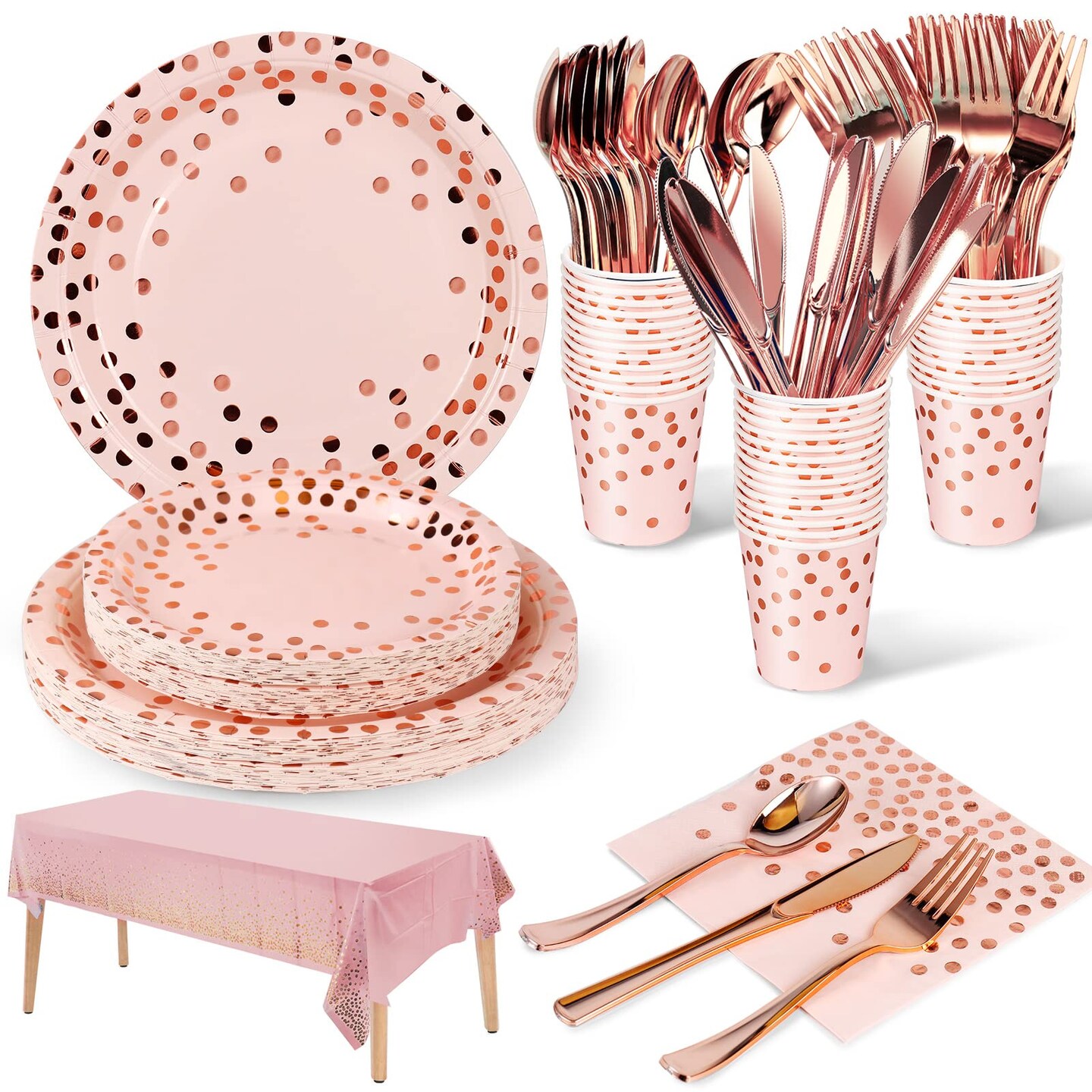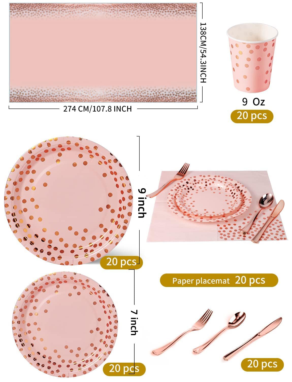 Nkaiso 141 Pieces Pink and Rose Gold Party Supplies, Disposable Party Decorations Sets Include Paper Plates Napkins Cups, Plastic Forks Knives Spoons, for Baby Shower Birthday Wedding -20 Guests