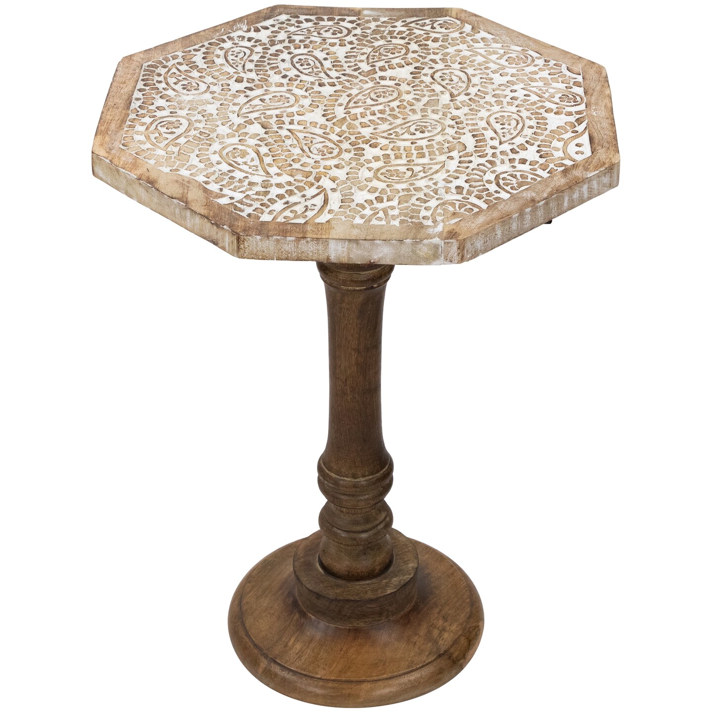 Northlight 21" Wooden Brushed White Engraved Paisley Octagonal Pedestal Side Table