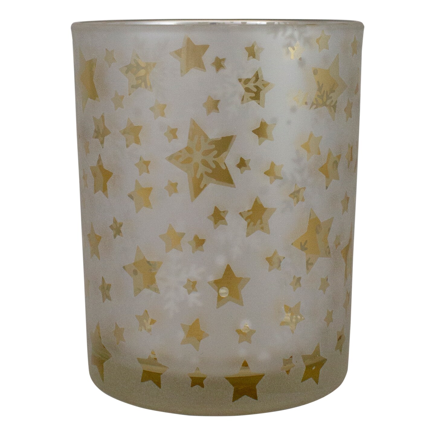 Northlight 5" Matte Silver and Gold Stars and Snowflakes Flameless Glass Candle Holder