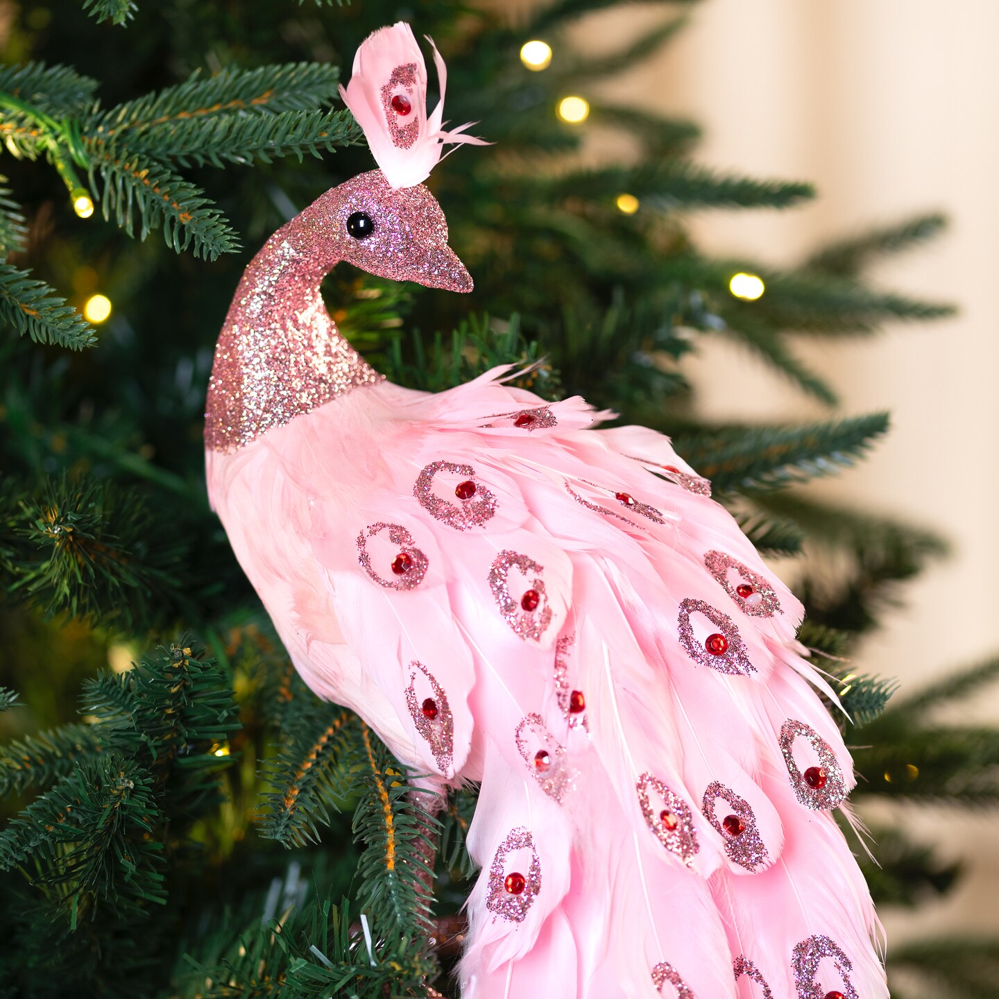 Northlight Peacock with Glitter and Faux Jewels Christmas Decoration - 20" - Light Pink