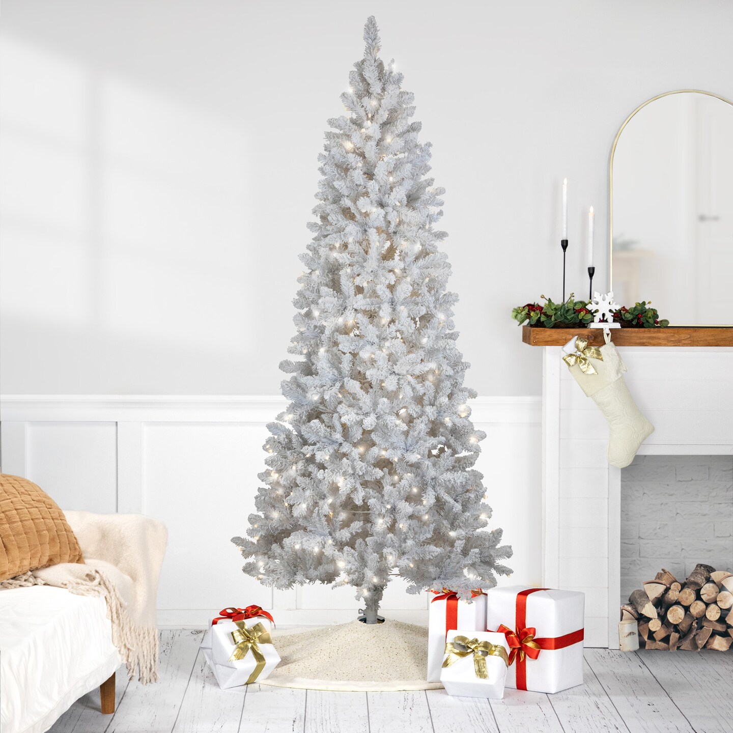 Northlight Pre-Lit Slim Flocked White Pine Artificial Christmas Tree - 7.5' - Warm White LED Lights