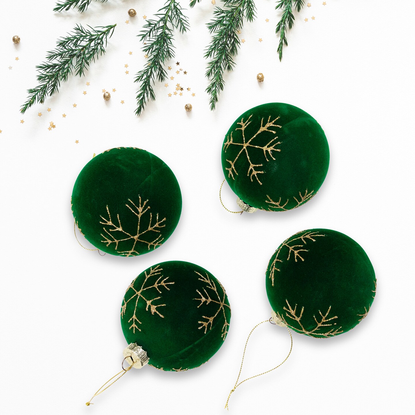Northlight Velvet Glass Christmas Ball Ornaments with Gold Snowflakes - 3" (75mm) - Green - 4ct