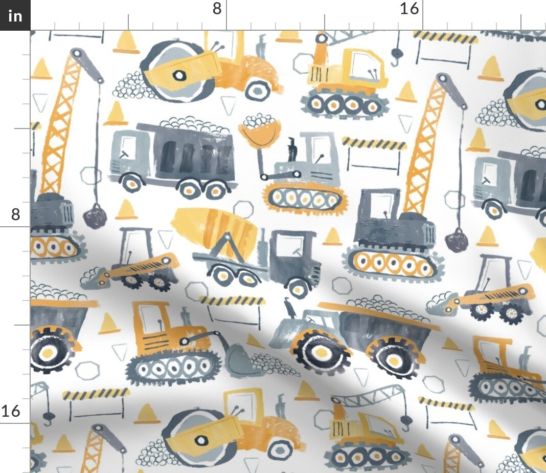 Nursery Construction Yellow Gray Trucks Kids Building Watercolor Bulldozer Excavator Custom Printed Fabric by Spoonflower Various Fabrics by the Yard or Fat Quarter
