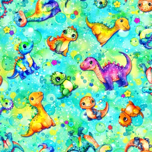 Oasis Fabrics Baby Dinos Tossed Dinos Aqua Cotton Fabric by the Yard