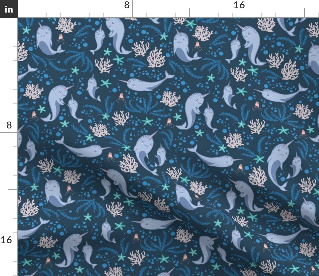 Ocean Animal Under The Sea Nautical Narwhal Waves Whimsical Custom Printed Fabric by Spoonflower Various Fabrics by the Yard or Fat Quarter