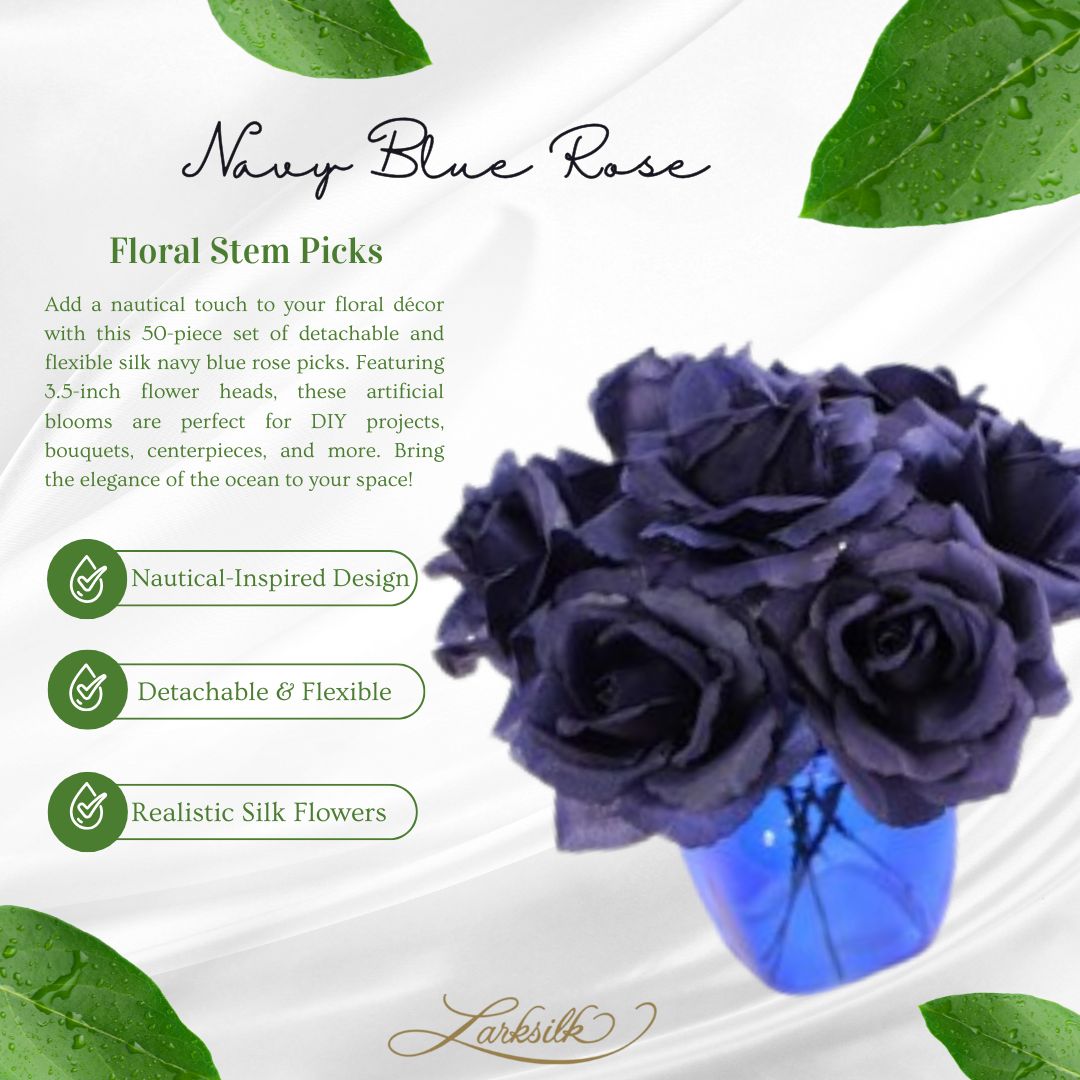 Oceanic Charms | 50-Piece Set | Detachable & Flexible Silk Navy Blue Rose Picks | 3.5" Flower Heads | Add a Nautical Touch to Floral Decor & DIY Projects, Floral Home by Artificial Flowers