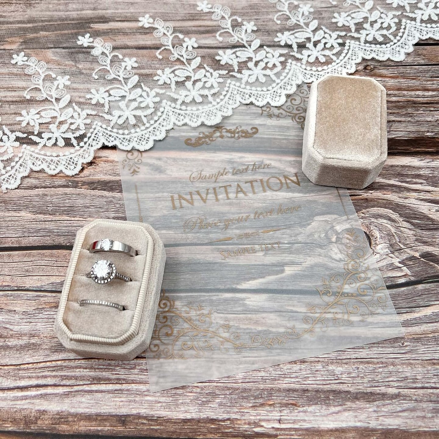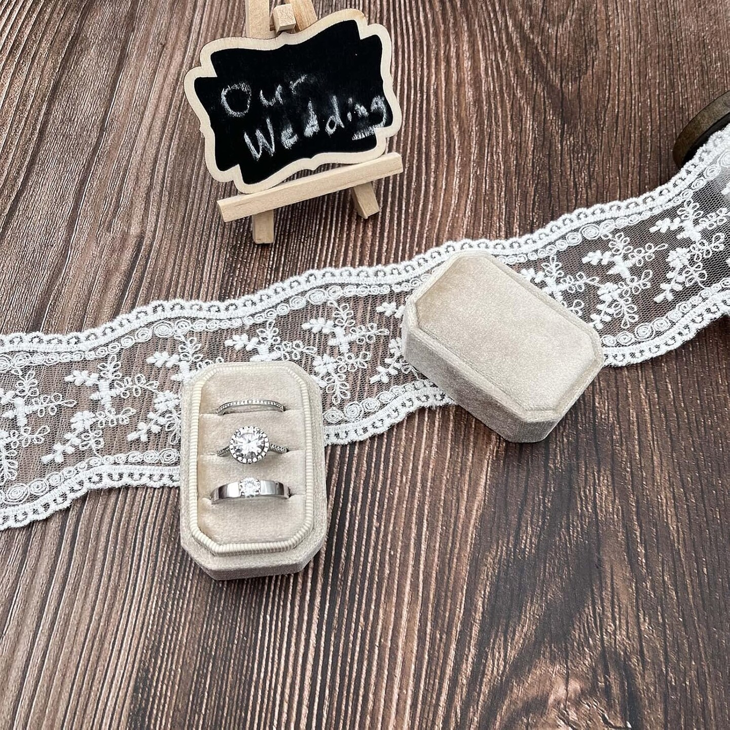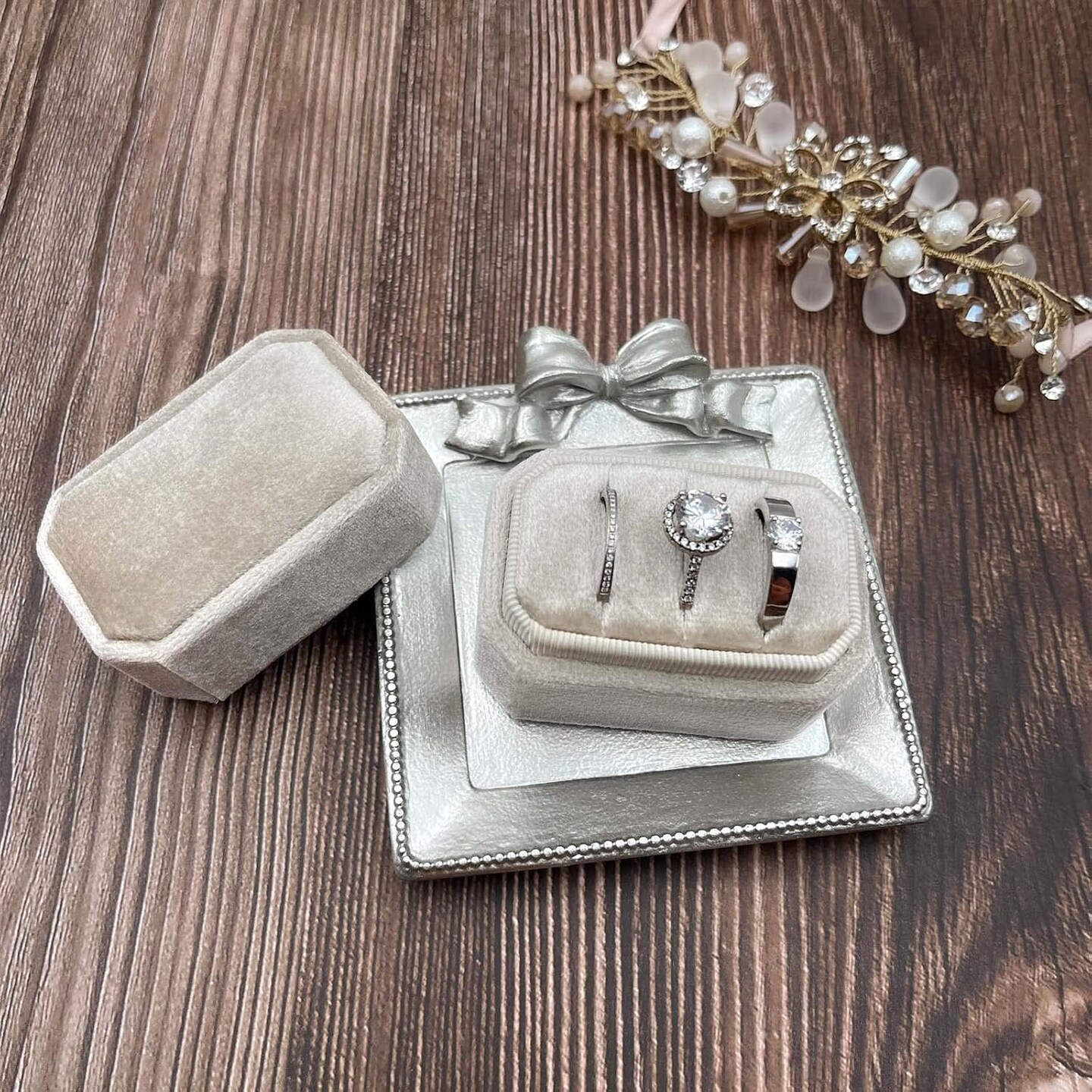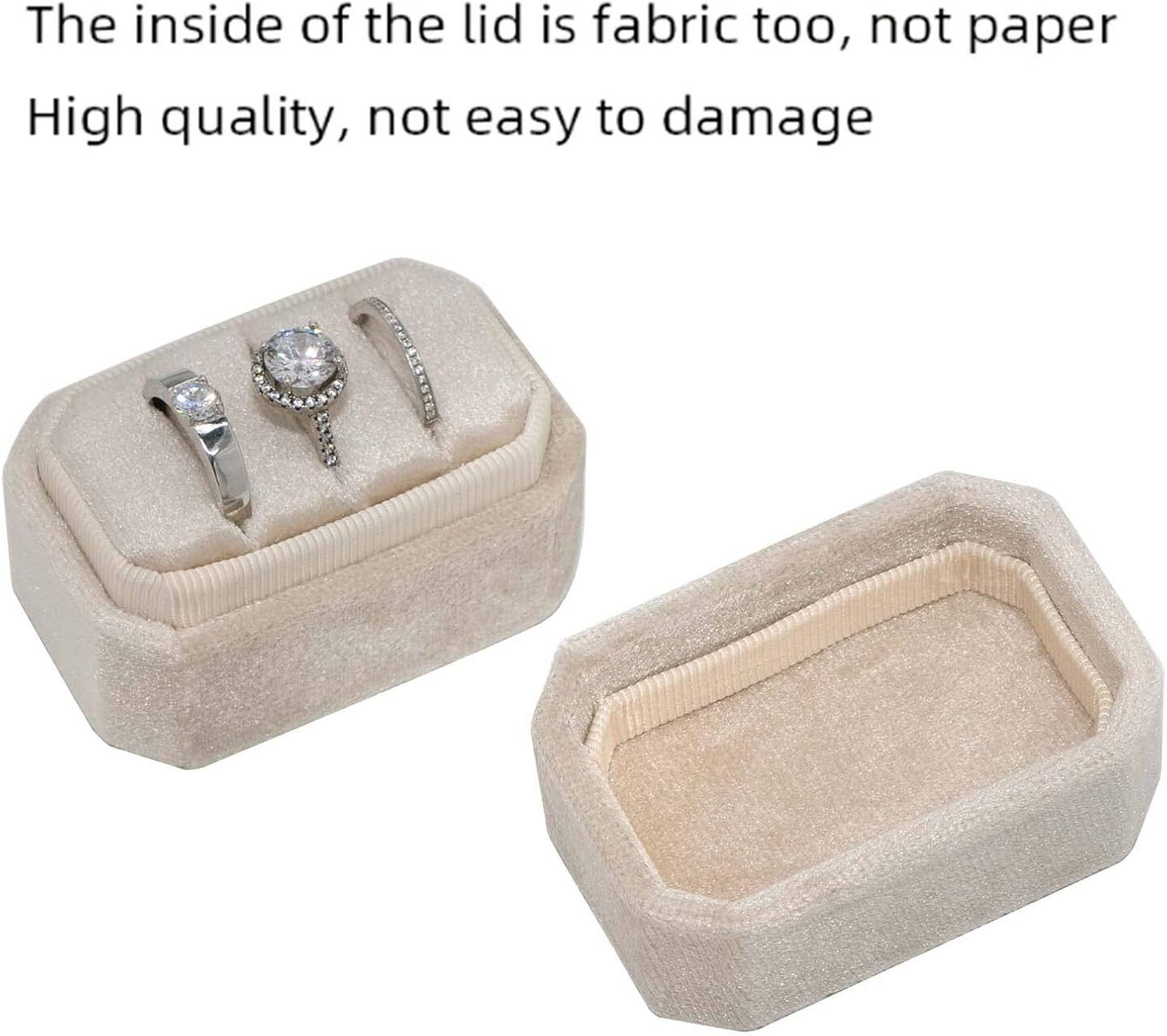 Octagonal Rectangle Velvet Ring Box 3 Slots - Premium Handmade Wedding Three Rings Bearer Holder Vintage Orthogon Jewelry Storage for Ceremony Proposal Engagement (Beige)