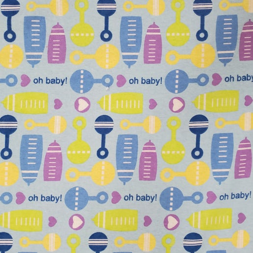 Oh Baby Bottles and Rattles Blue Cotton Flannel Fabric by the Yard