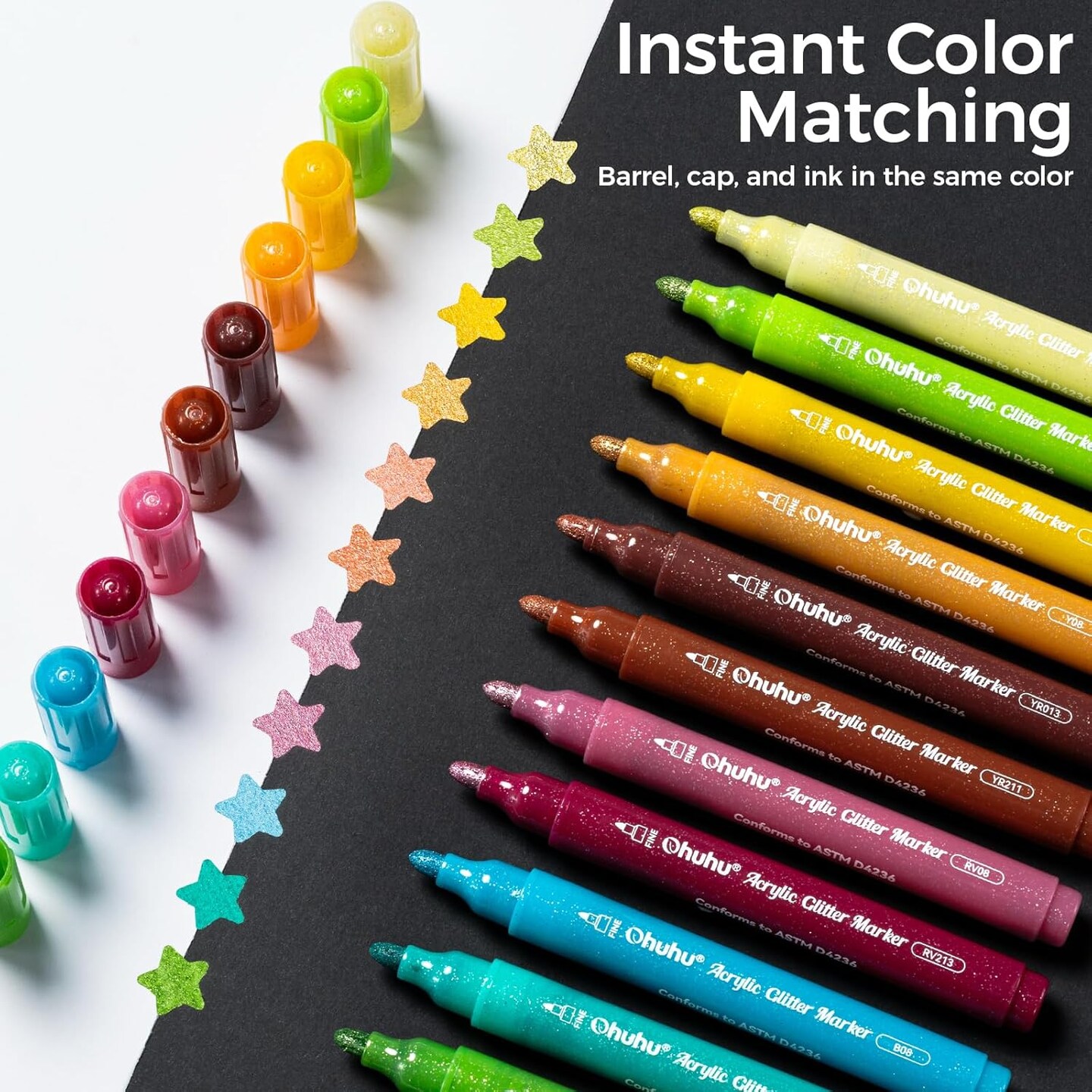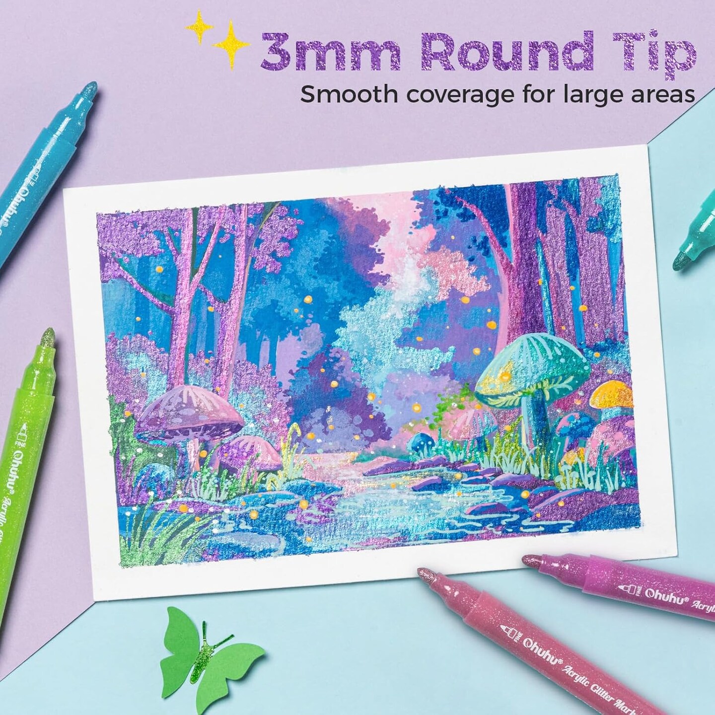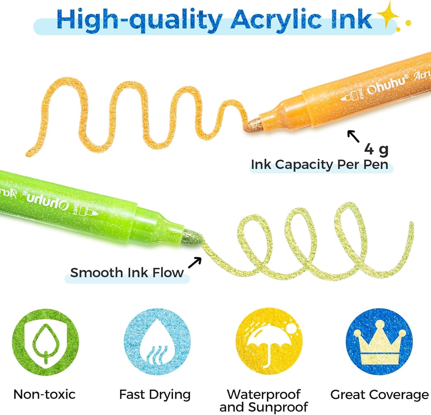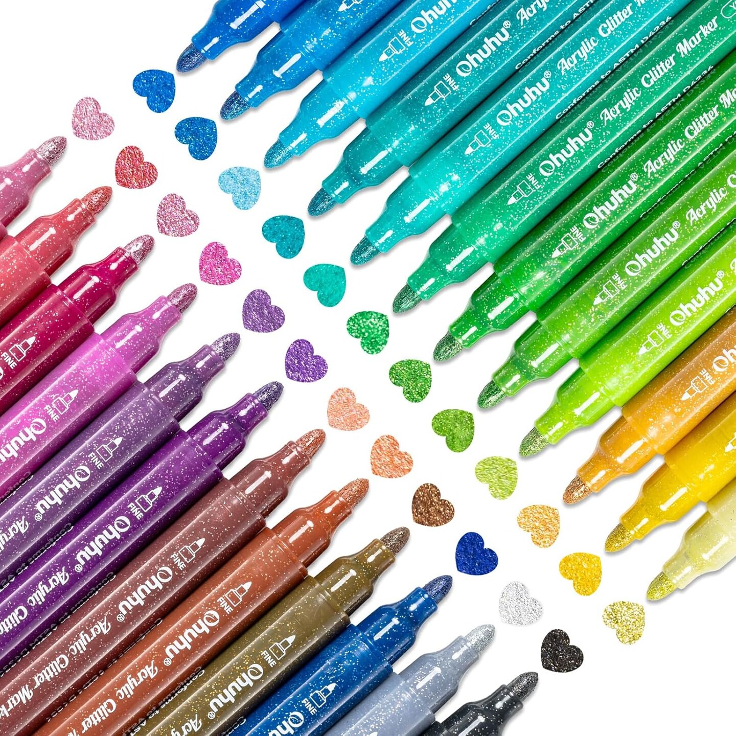 Ohuhu Acrylic Glitter Markers, 24 Metallic Glitter Colors, Fine Tip Paint Pens & Shimmer Accents, Water-Based & Quick Dry, for DIY Crafts, Cards, Journals, Wood & Rock Painting, Extra Fine Tip 0.7mm/ Medium Tip 3mm