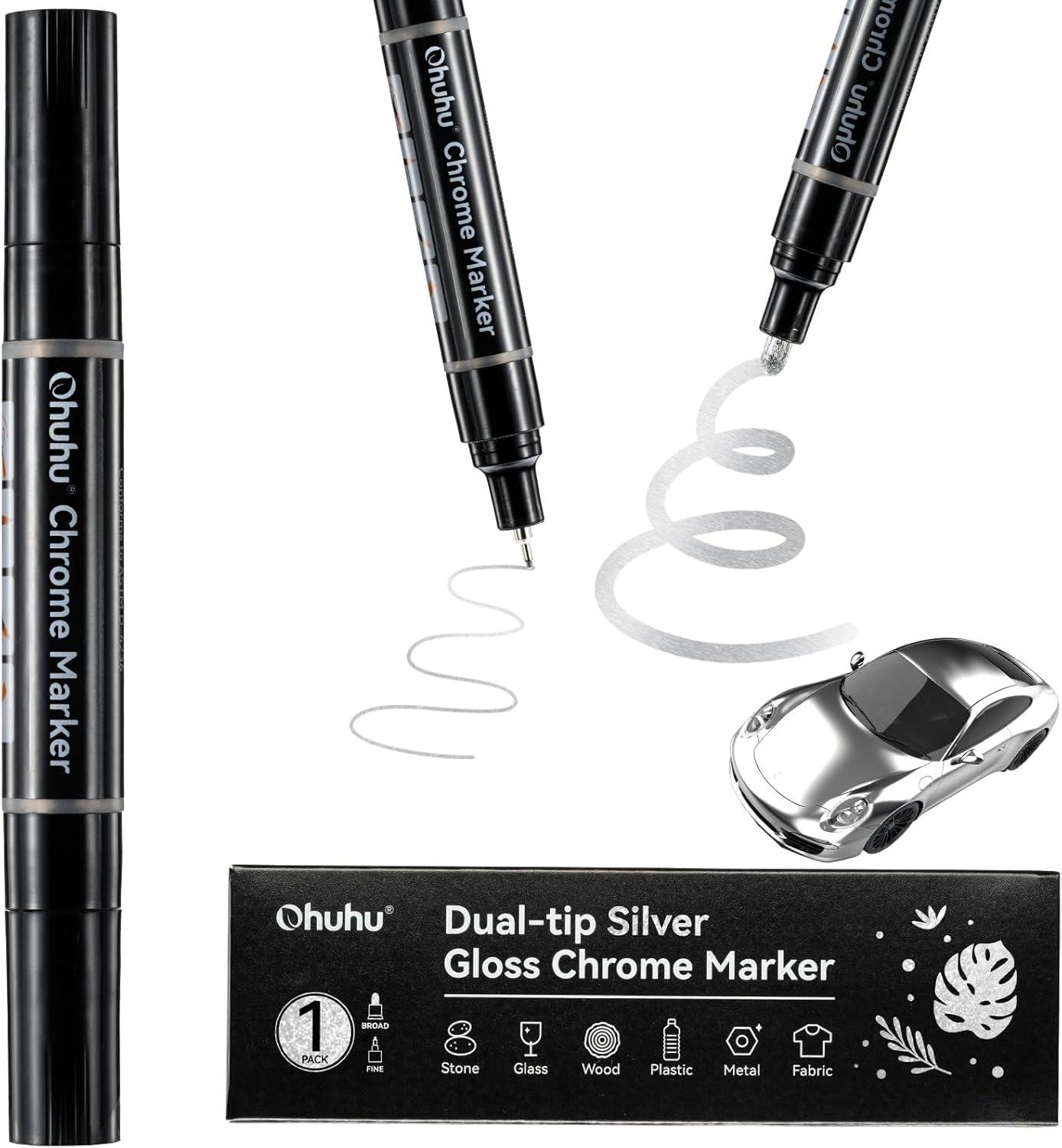 Ohuhu Chrome Paint Pen: Silver Liquid Chrome Markers with Gloss Mirror Water-Proof Lightfast Permanent Paint Markers for Repairing Metal Glass Plastic Car Tire DIY Crafts Models Posters
