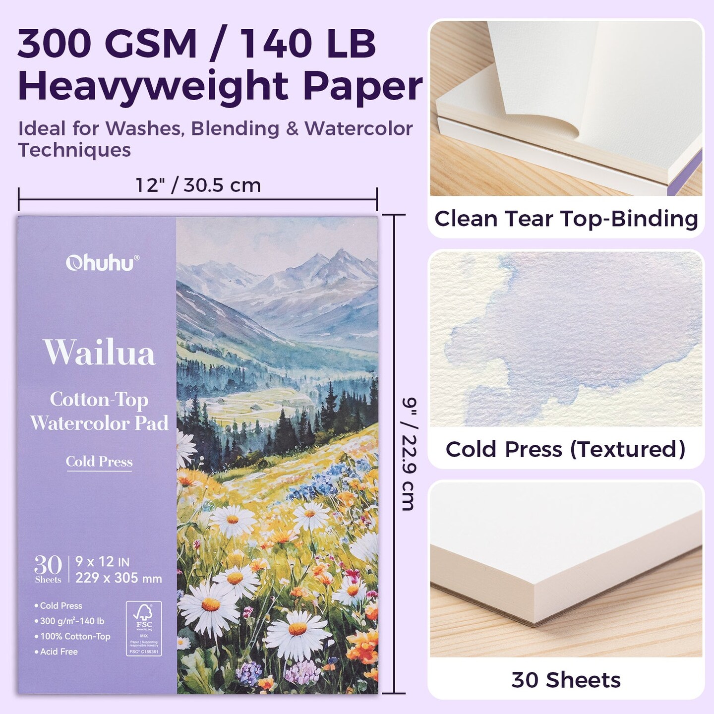 Ohuhu Cotton-Top Watercolor Paper Pad: 9"x12" Cold Press/Hot Press Paper - 140 lb/300 GSM Heavyweight White Paper - Water Color Paper for Watercolor Gouache Ink Acrylic Professional Artist