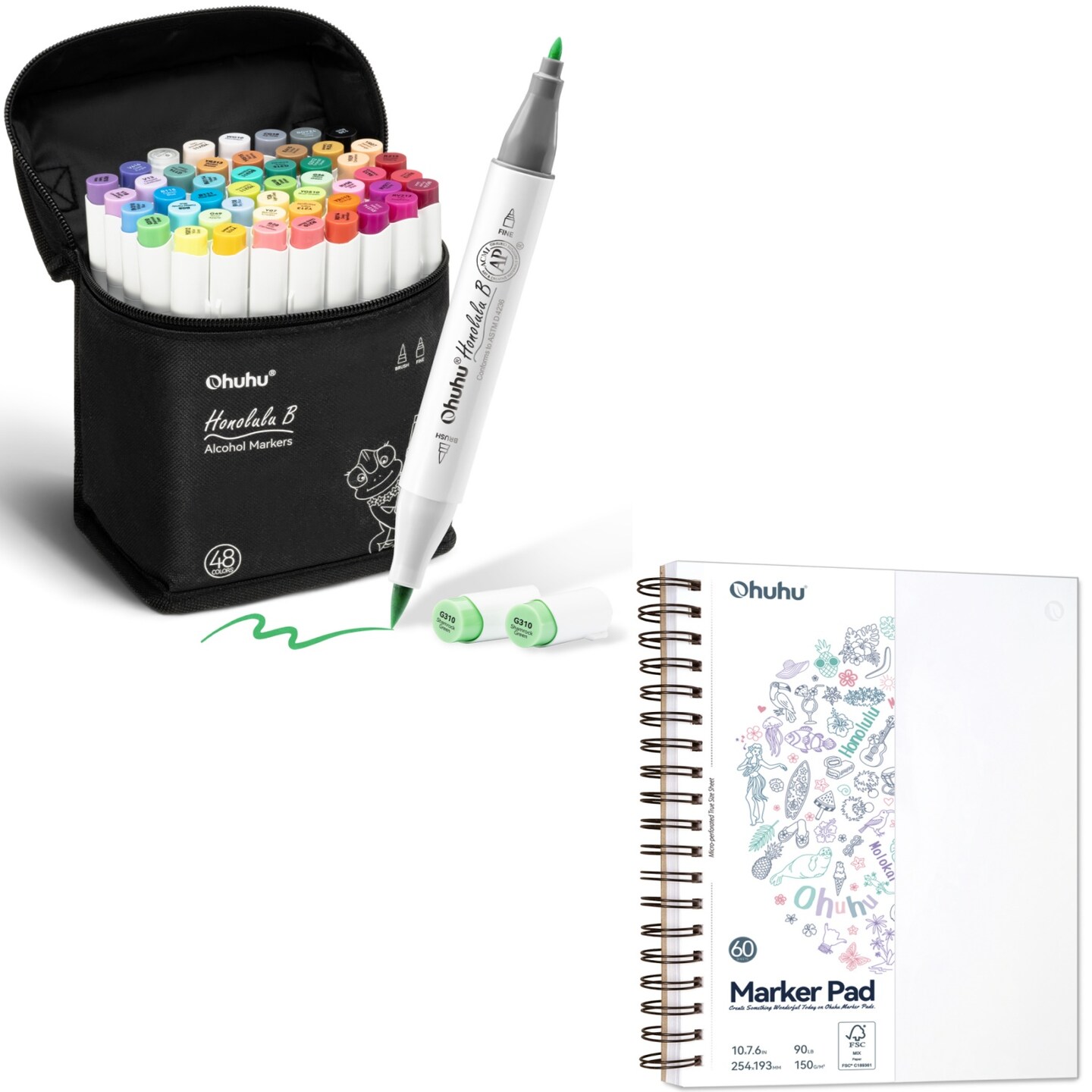 Ohuhu Honolulu B 48 Colors Alcohol Markers + 7.6" x 10" Double-Sided Bleedproof Marker Pad