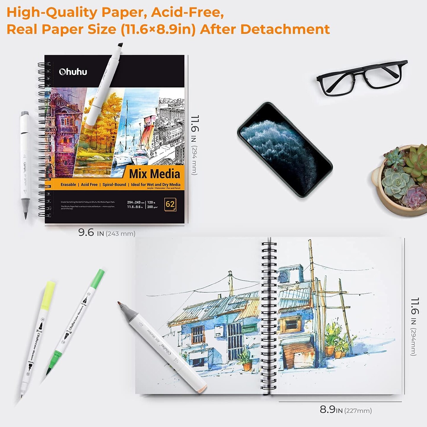 Ohuhu Mix Media Pad, Mixed Media Art Sketchbook, 120 LB/200 GSM Heavyweight Papers, Spiral Bound Mixed Media Paper Pad for Acrylic, Painting Christmas Gift