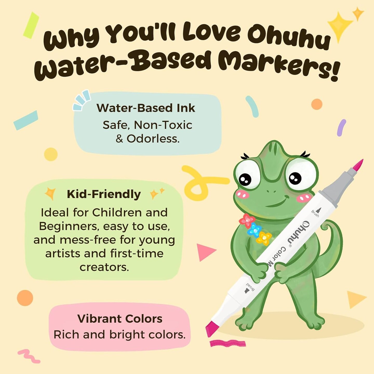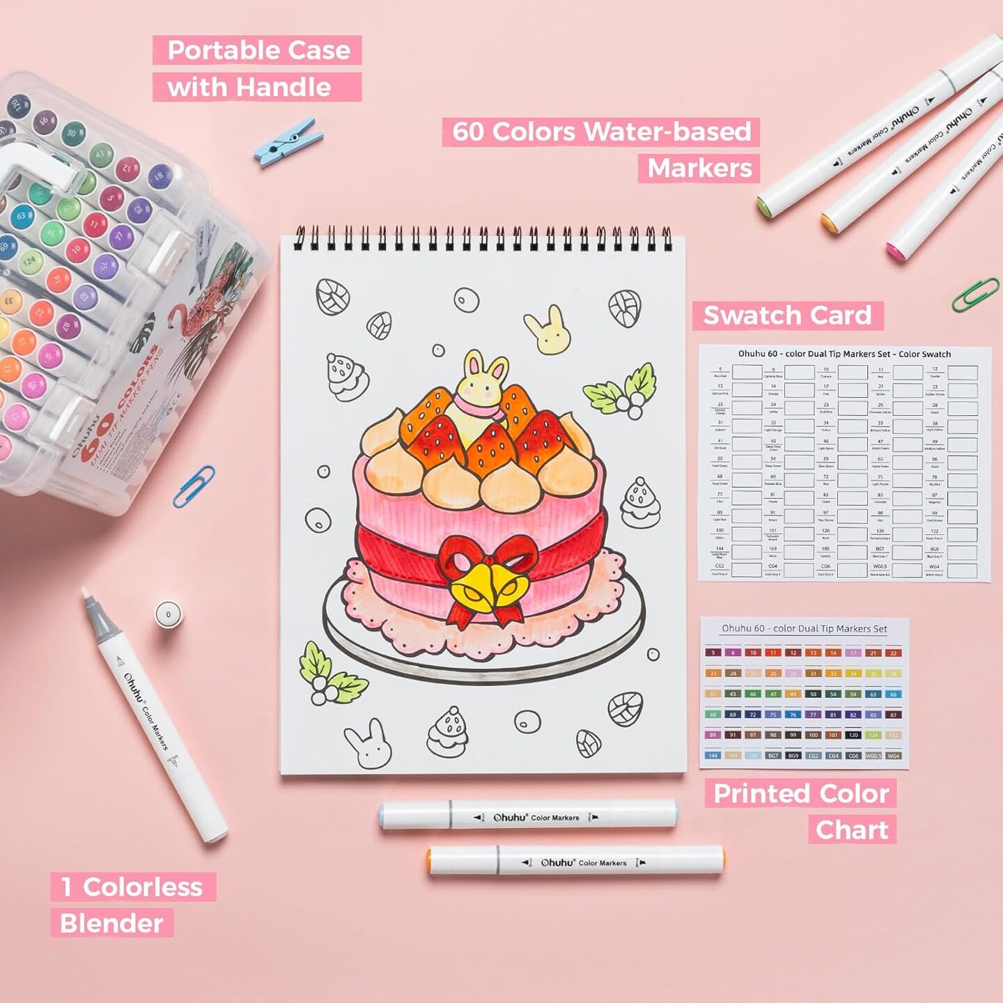 Ohuhu Water Based Markers for Adult Coloring Books - 60 Colors No Bleeding Water-based Coloring Markers - Drawing Pens Art Markers for Kids Adults Beginners Lettering Journaling - Dual Tips Brush & Chisel/ Brush & Fine