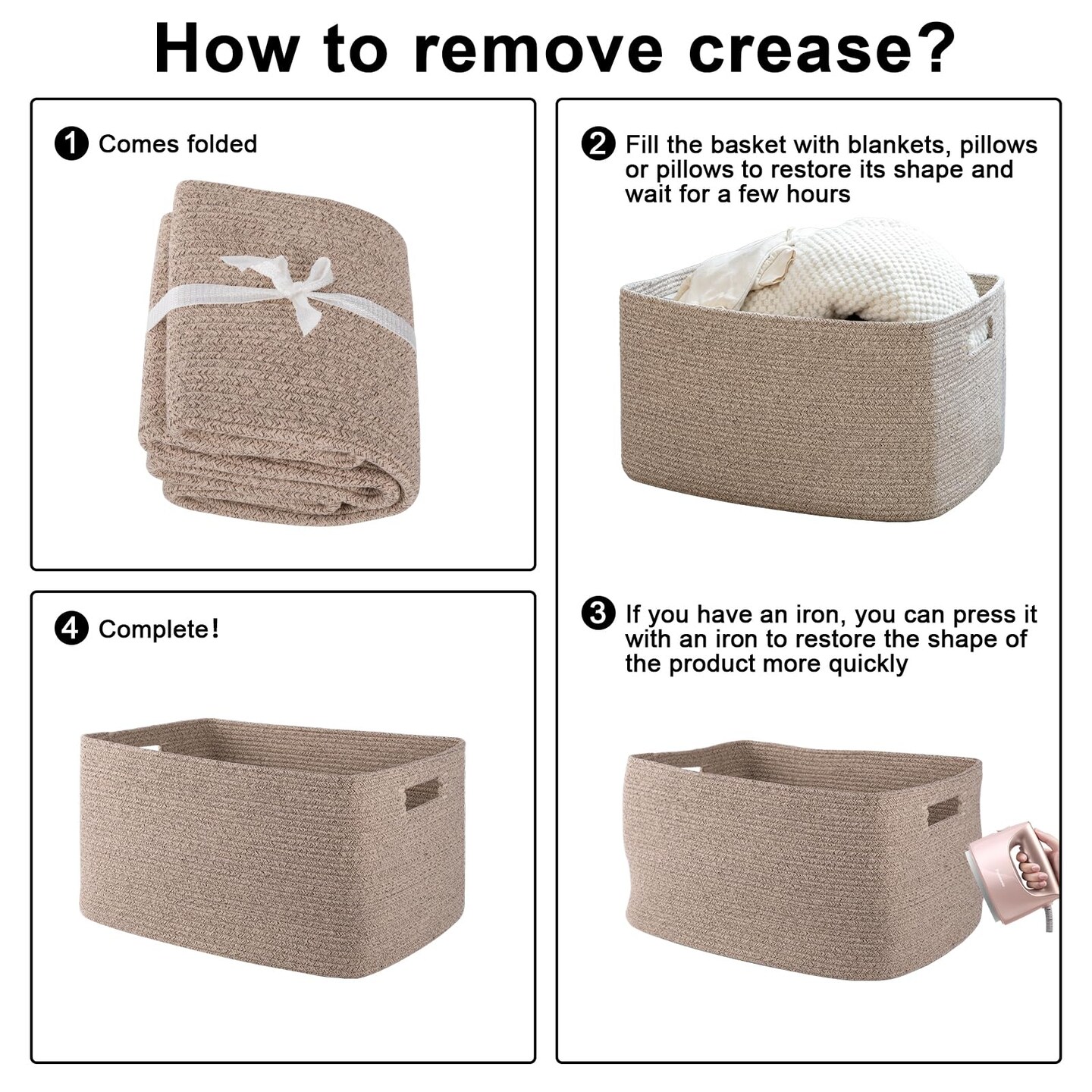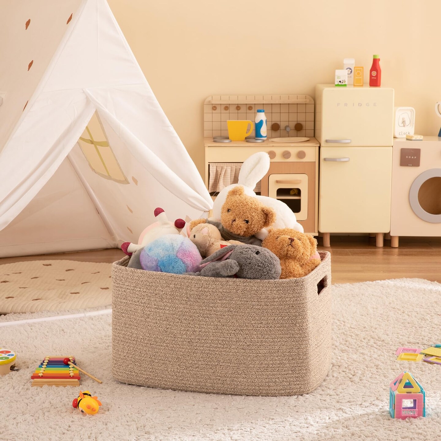 OIAHOMY Cotton Rope Basket, Rectangle Woven Nursery Blanket Basket, Toy Storage Basket with Handle, Baskets for Organizing, 18”x14”x12”, Brown variegated